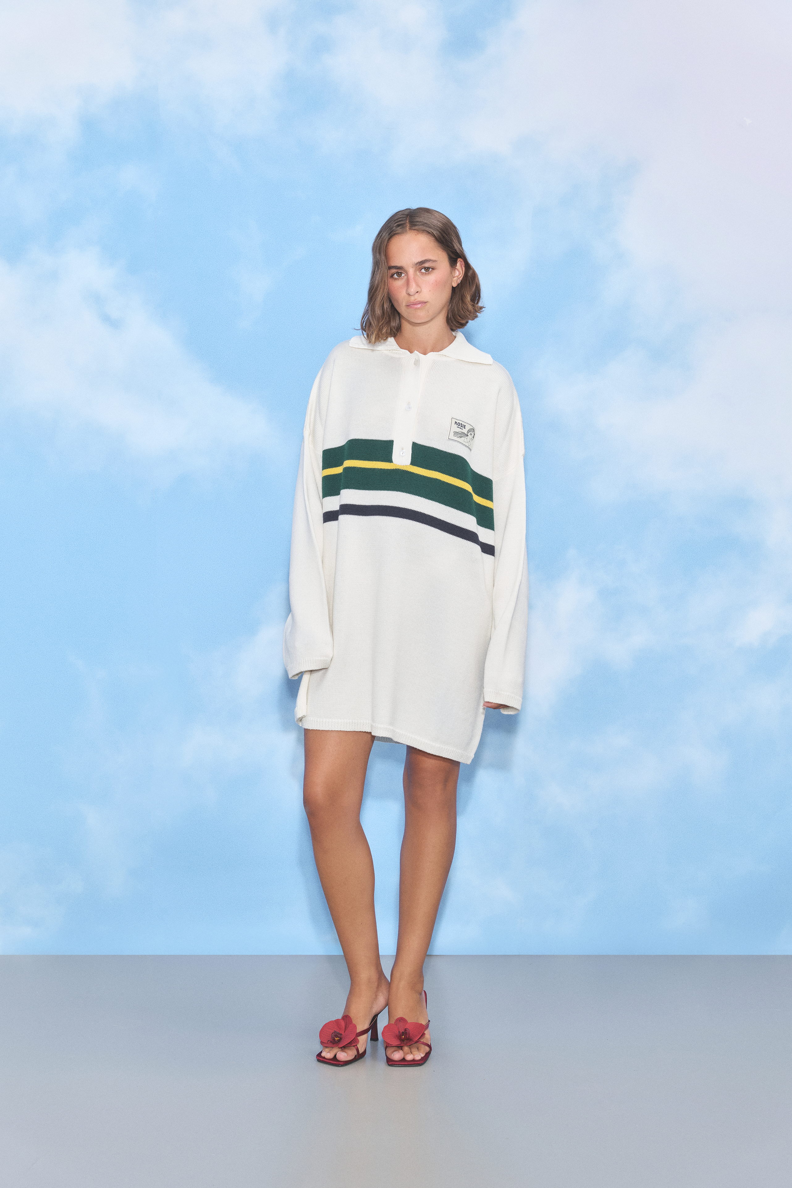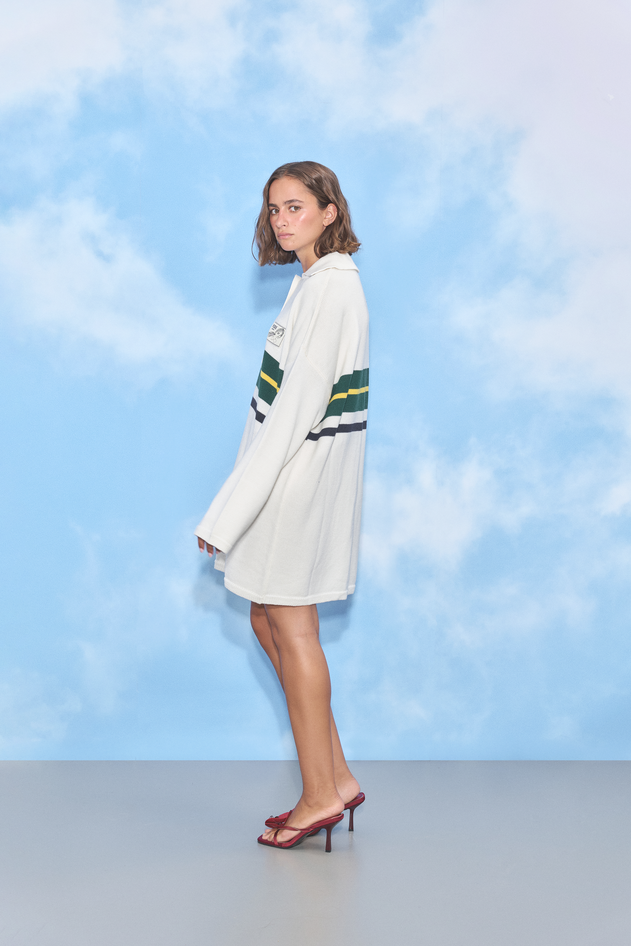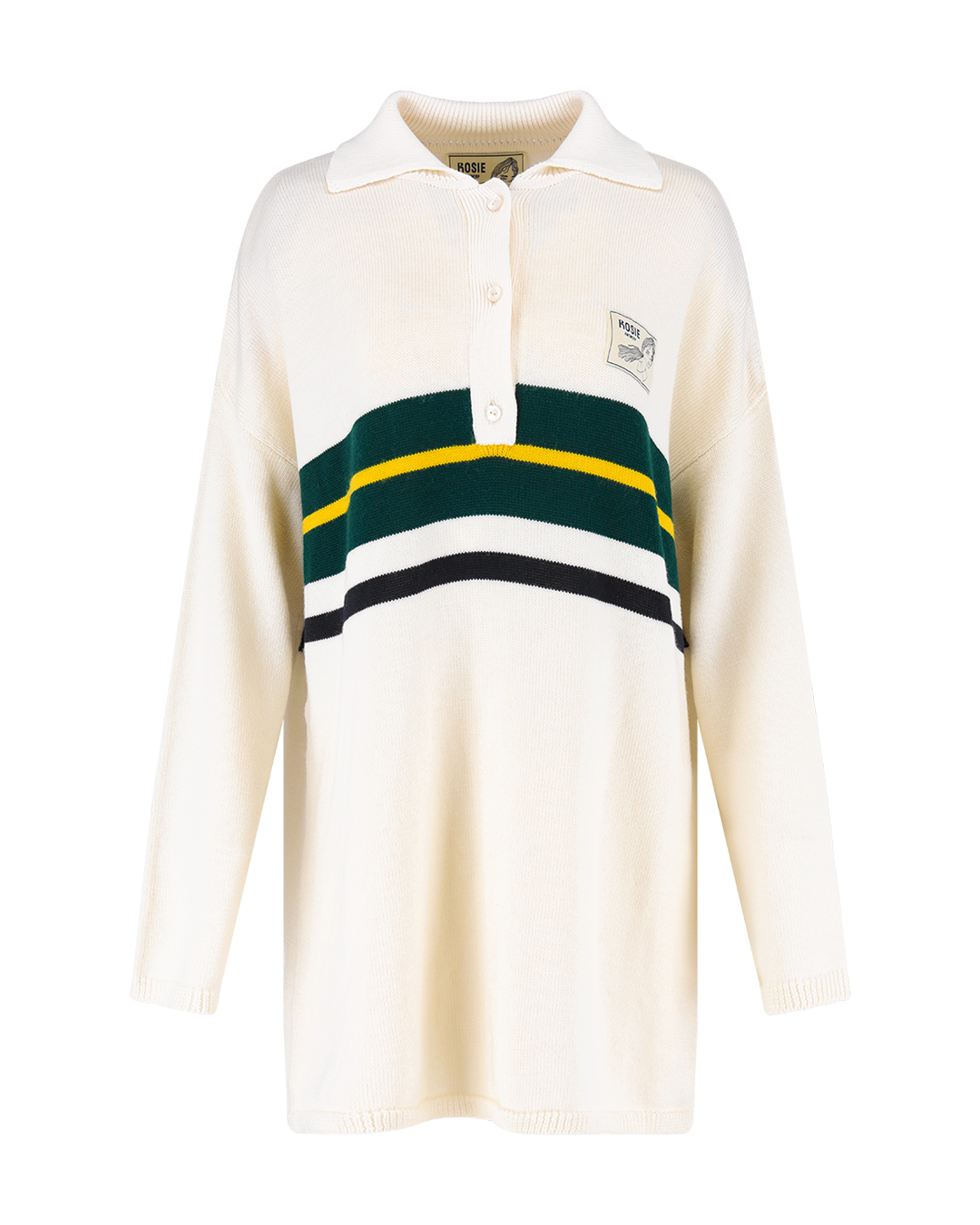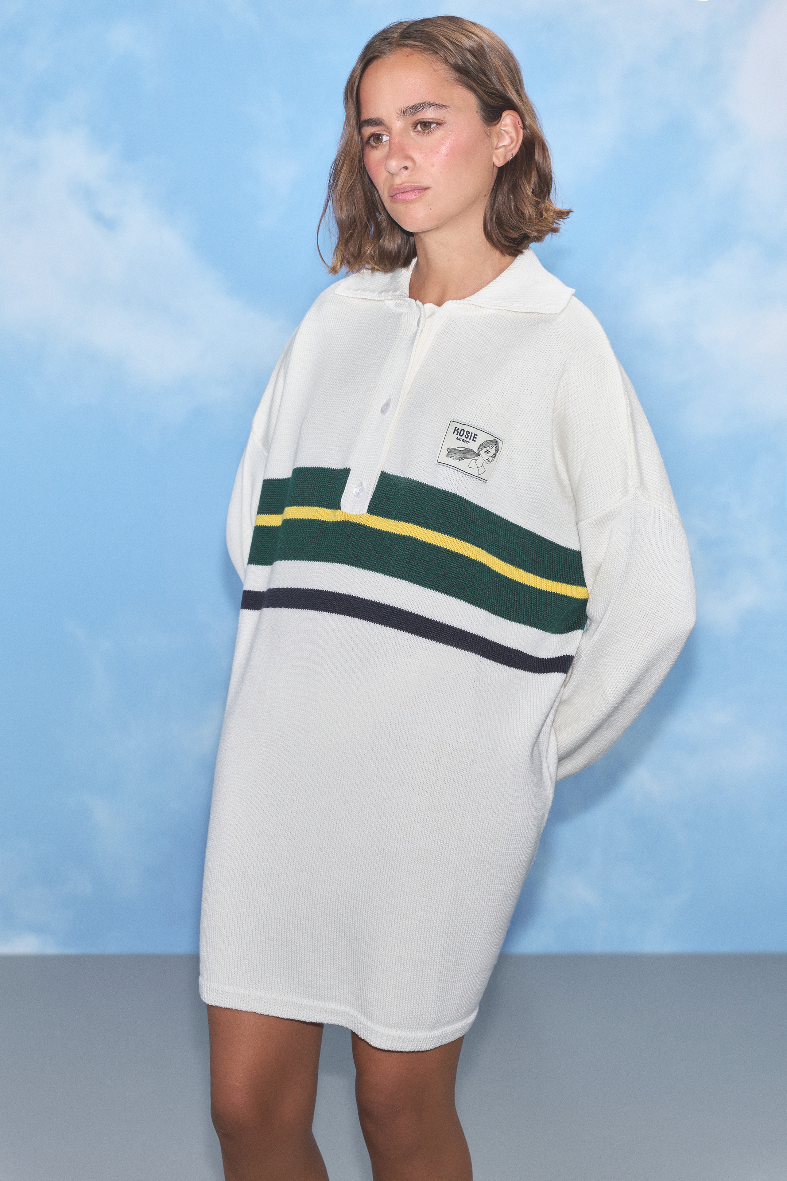 a wool polo dress with a relaxed fit. Finished with a classic collar, button placket, and contrast stripe detailing, it blends sporty style with cozy comfort. Can be worn as a dress or a sweater