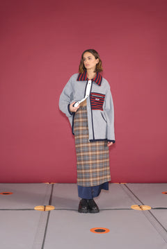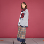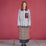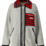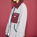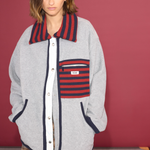 The Xina Vest is made from soft grey fleece with a relaxed, boxy fit. It features navy and red striped knit accents on the collar and chest pocket, finished with a small ROSIE label, a reflective button tab and jersey trims.
