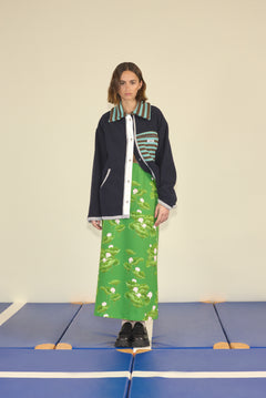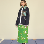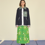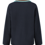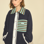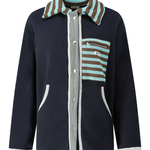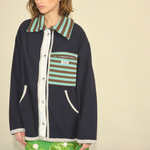 The Xina Vest is made from soft grey fleece with a relaxed, boxy fit. It features blue and brown striped knit accents on the collar and chest pocket, finished with a small ROSIE label, a reflective button tab and jersey trims.