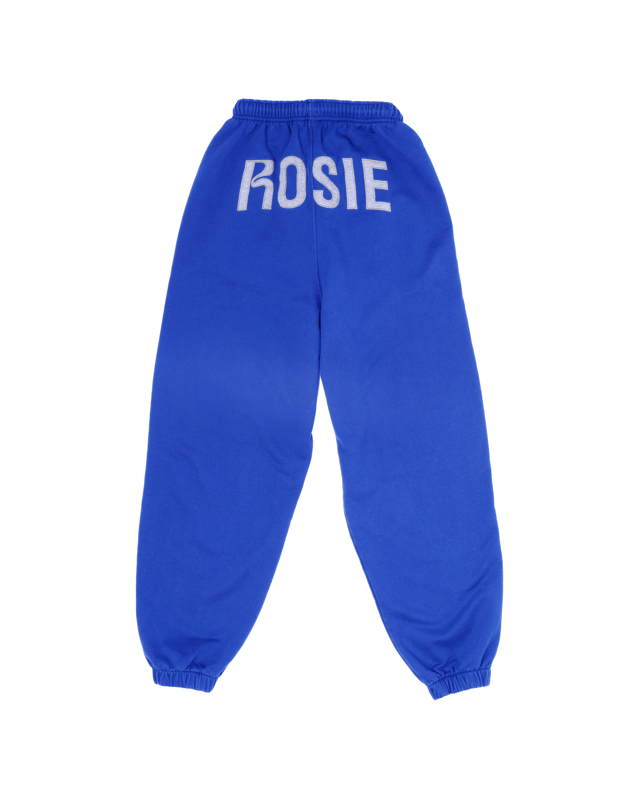 AN OVERSIZED PAIR OF BLUE UNISEX SWEATPANTS FEATURING A VARSITY STYLE EMBROIDERY OF THE ROSIE ANTWERP LOGO ON THE BACK