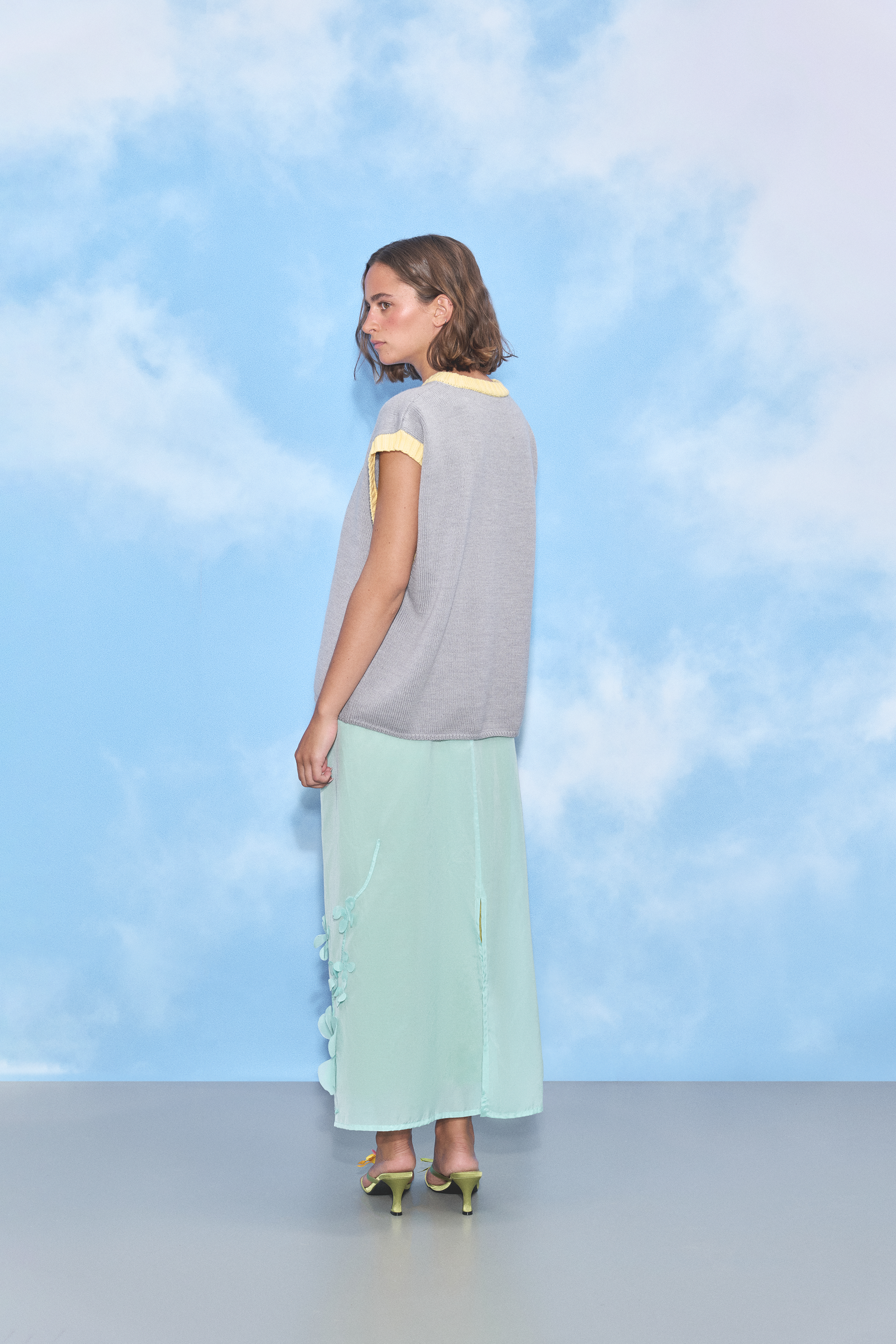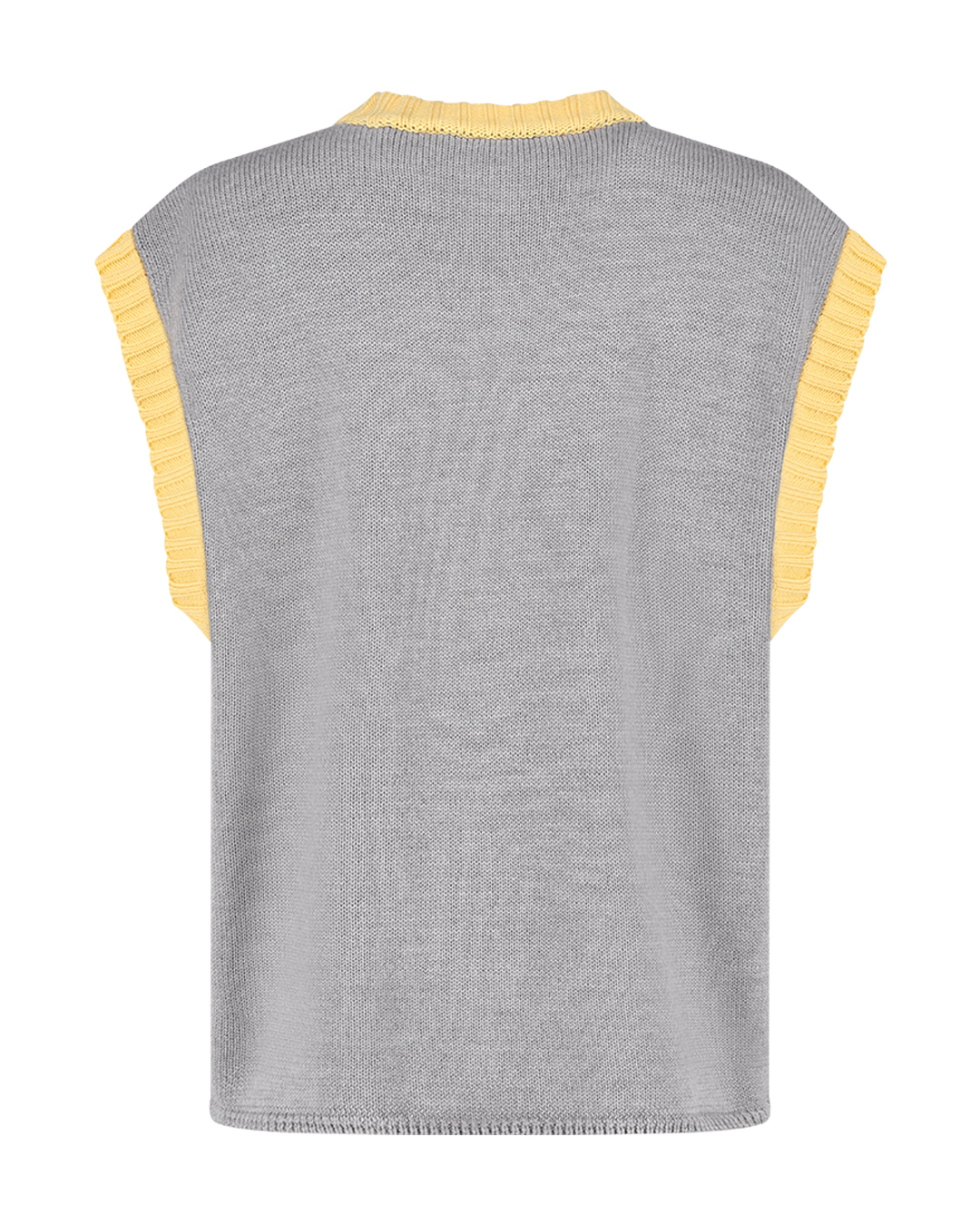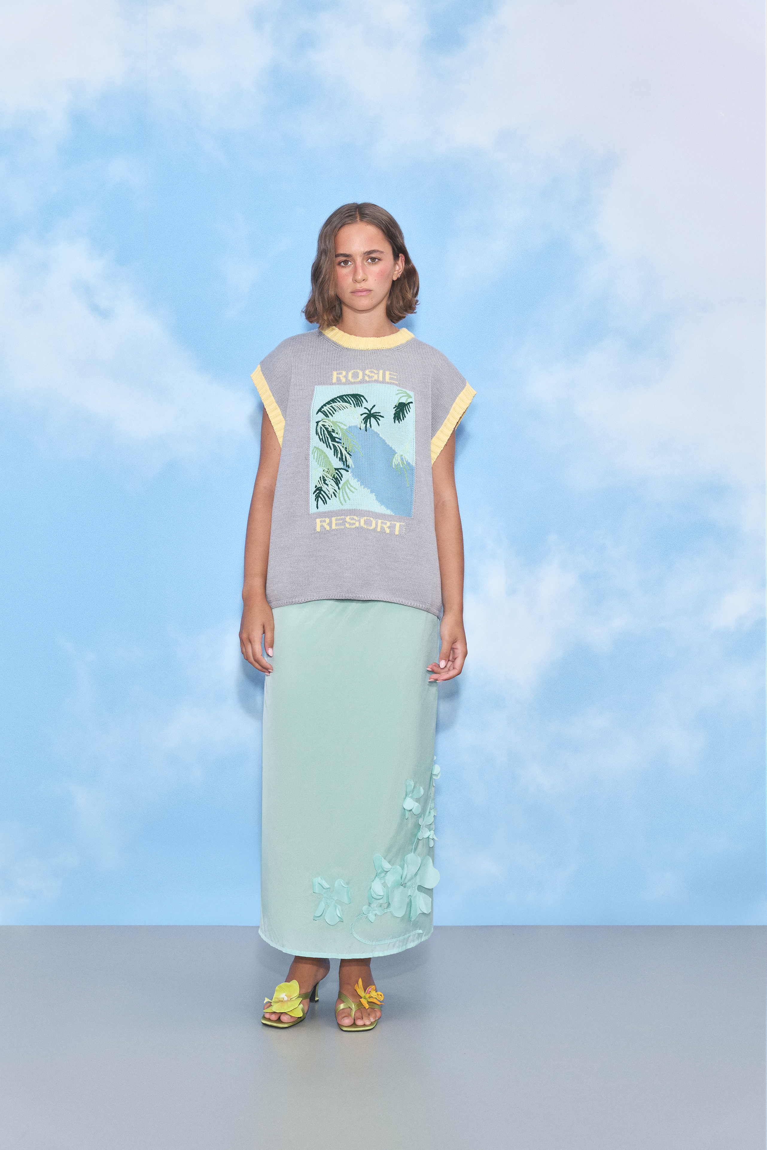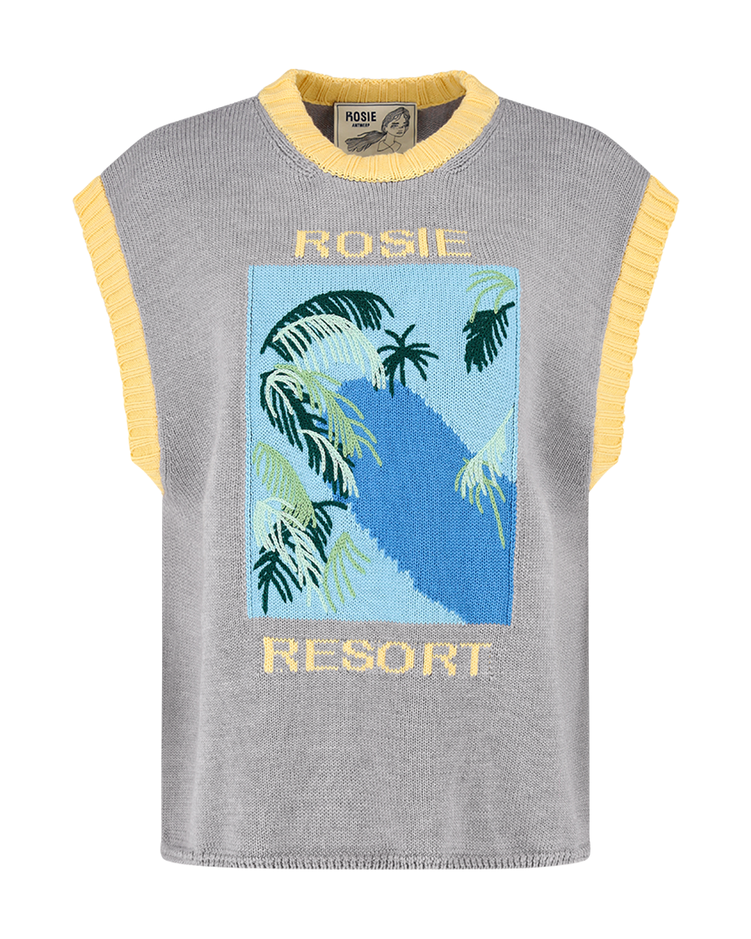 This sleeveless knitted top features a relaxed fit with soft ribbed edges and a graphic resort-inspired landscape on the front