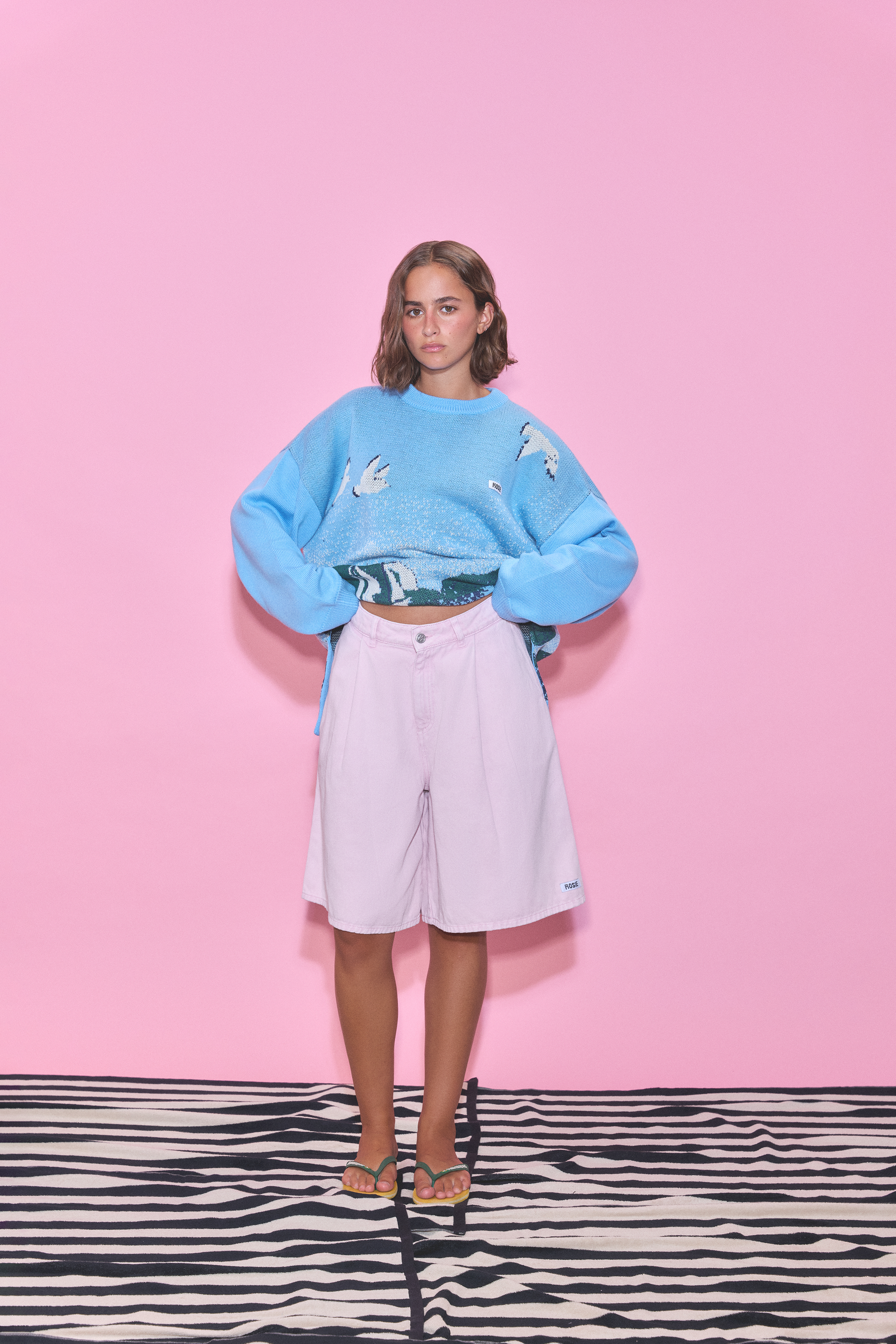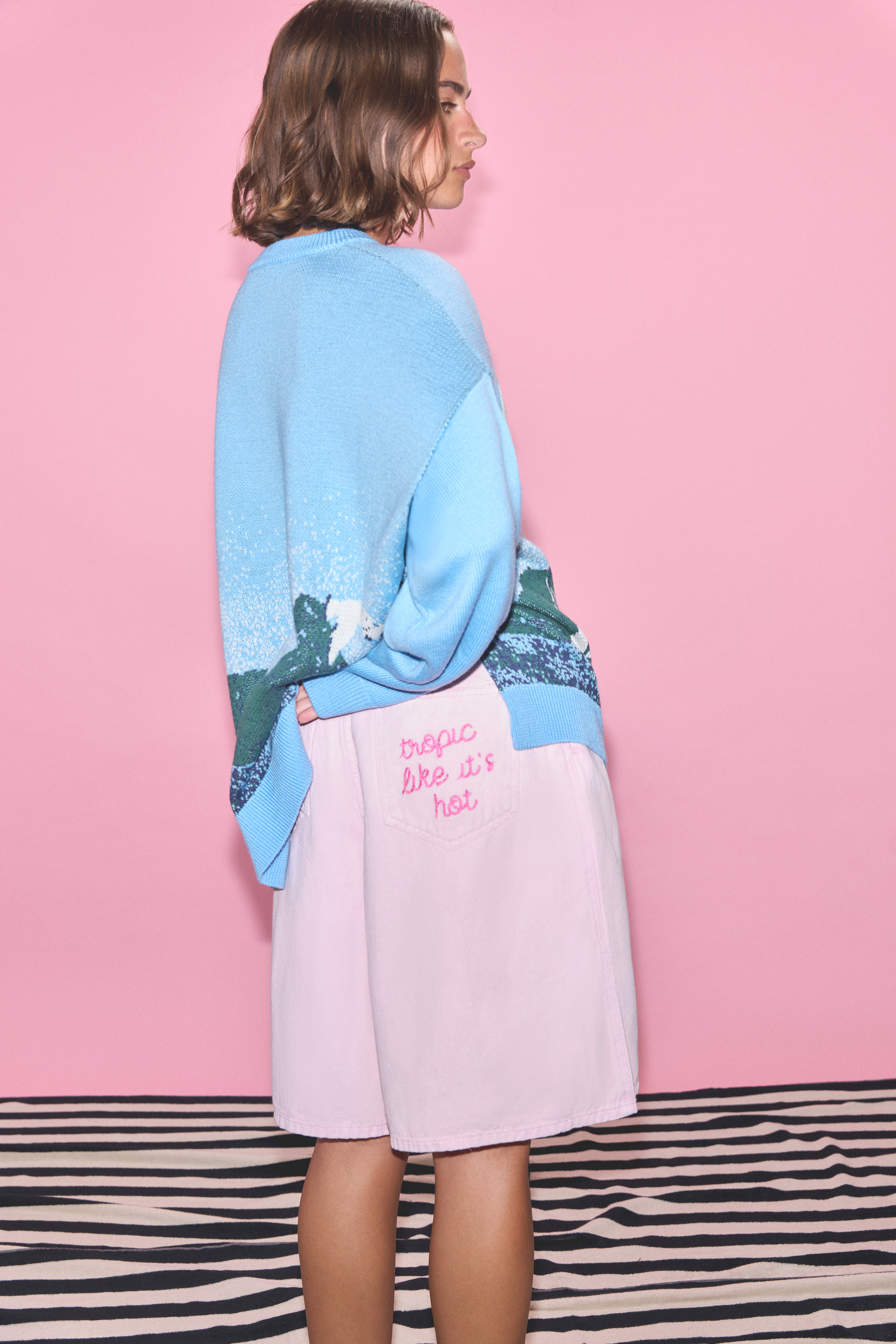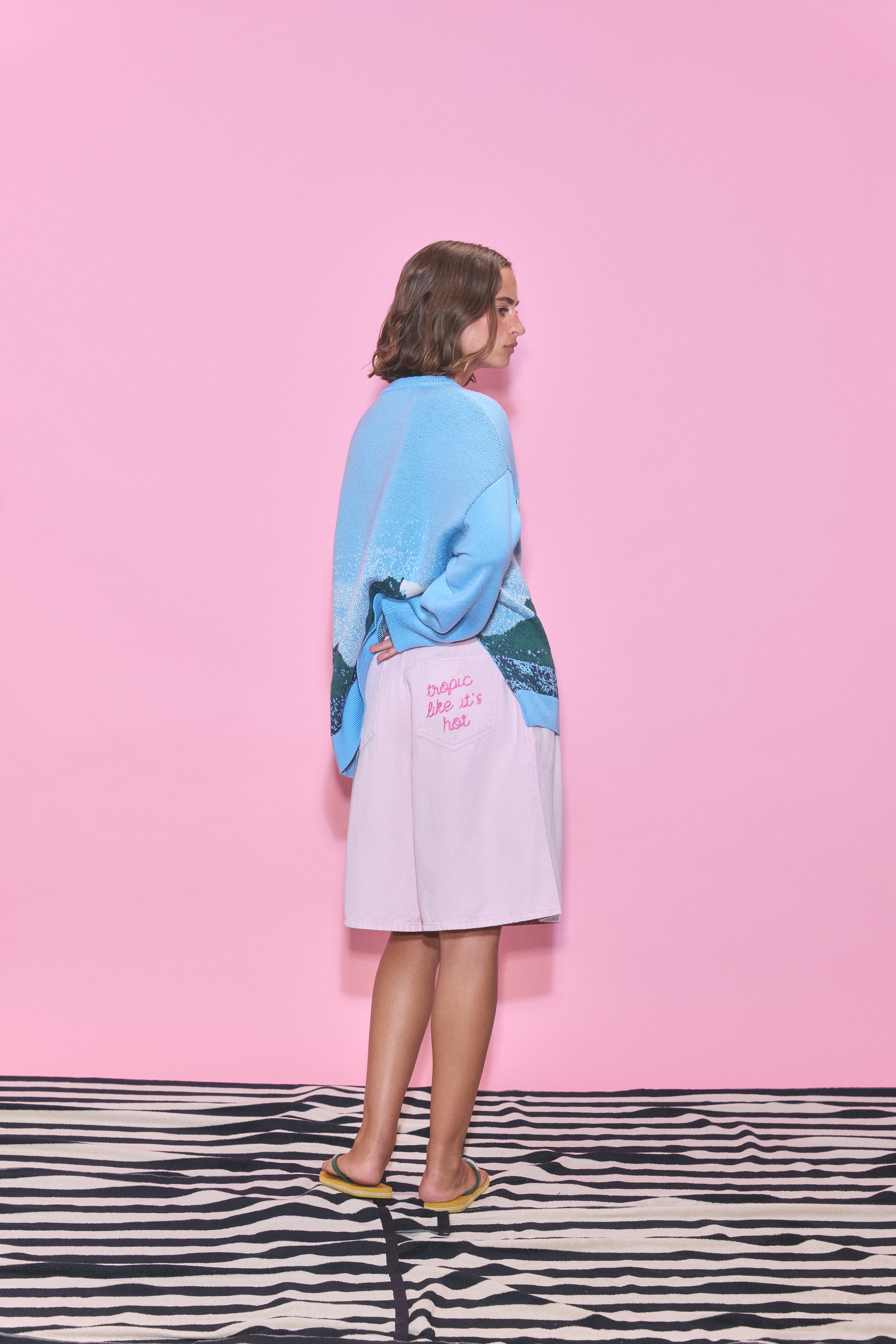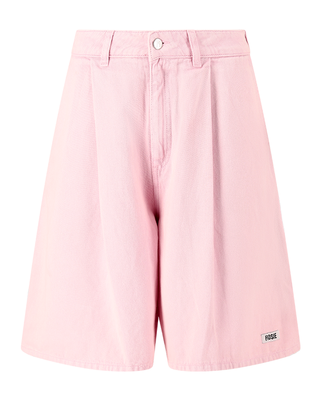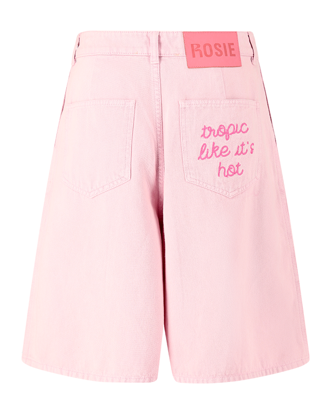 A pair of mid-length shorts in a washed pink color featuring a back pocket 'Tropic like it's hot' embroidery and a pink Rosie patch