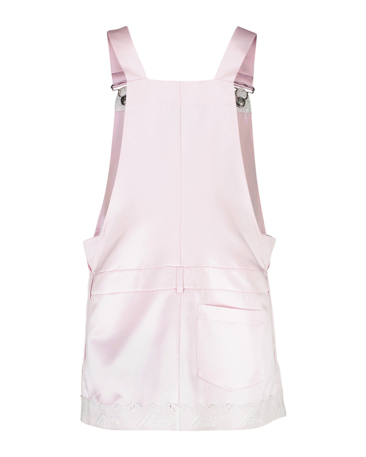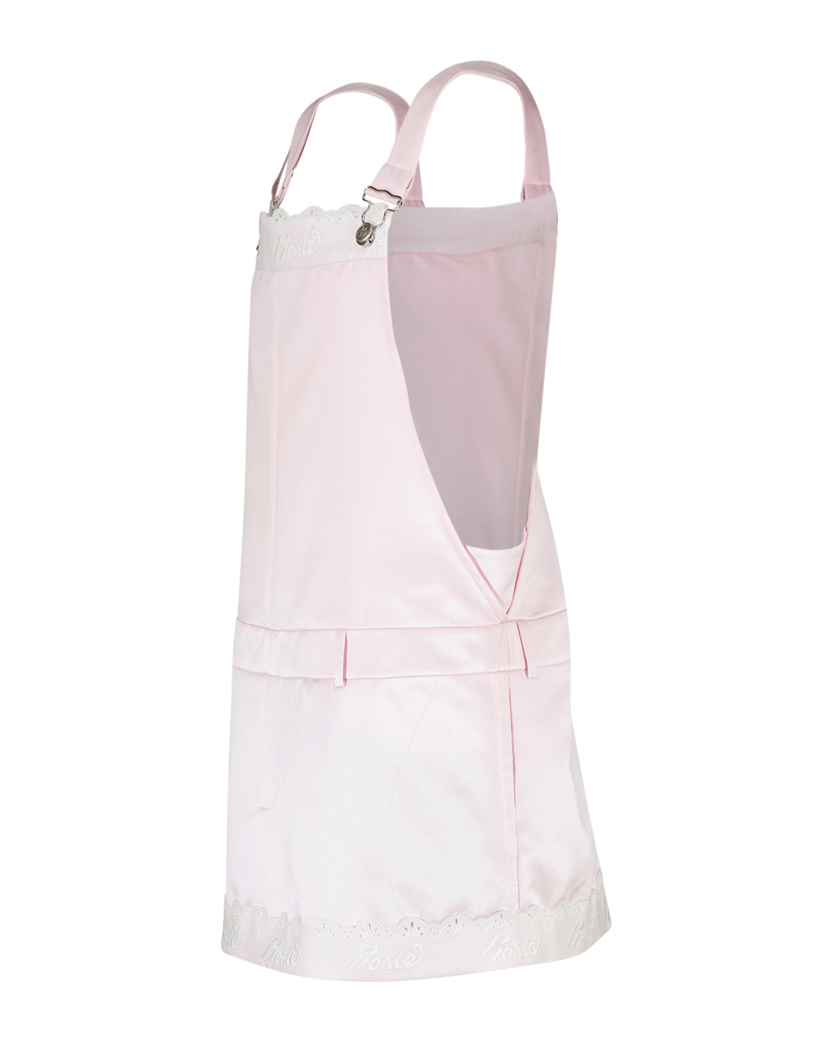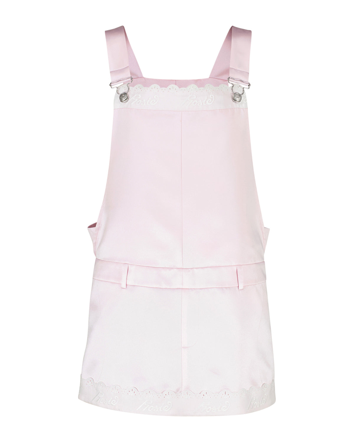 A soft pink dungaree style mini dress with Rosie embroidered white cotton detailing