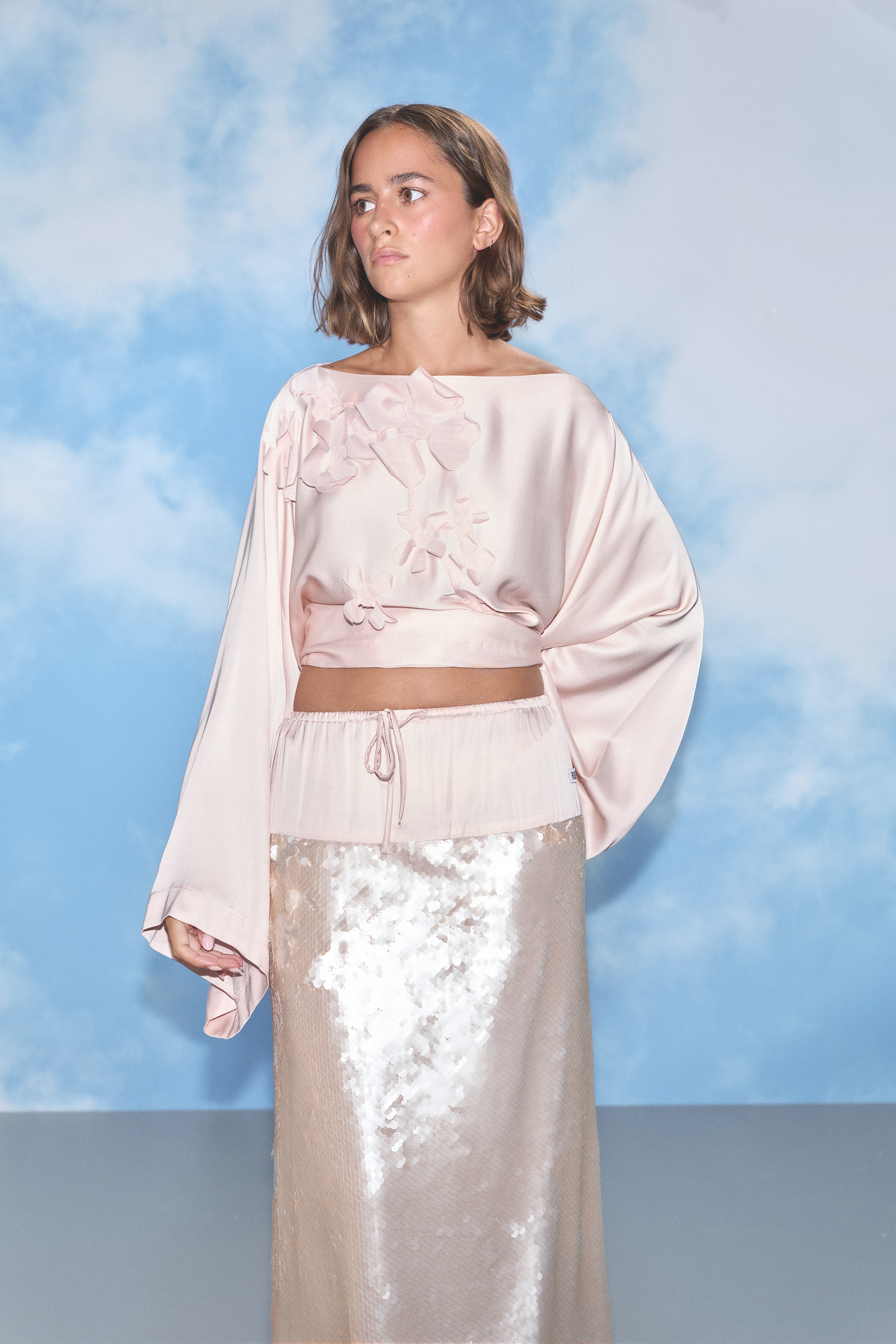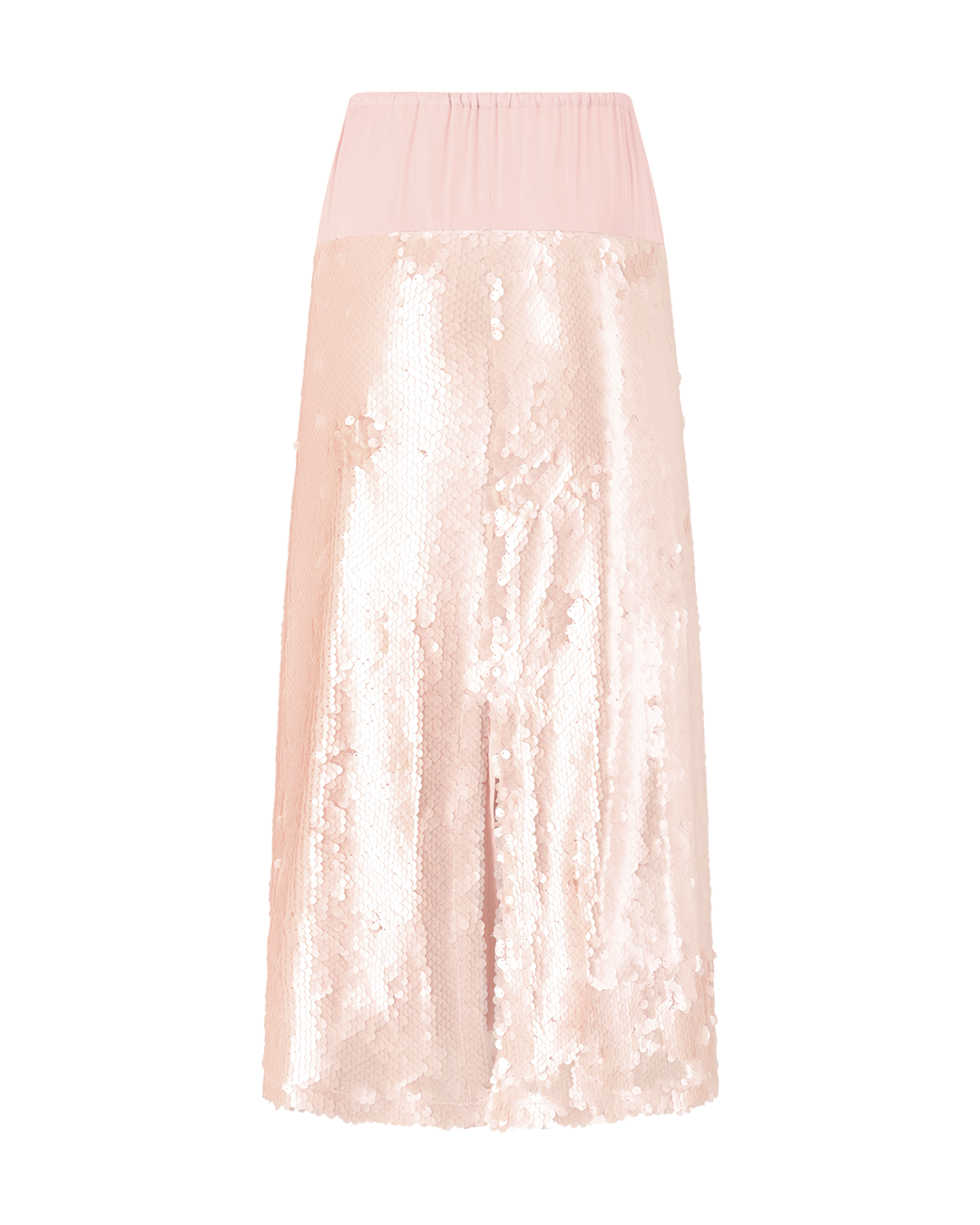 A sequin skirt with a back split, contrast fabric at the top with a matching drawstring, and a Rosie label