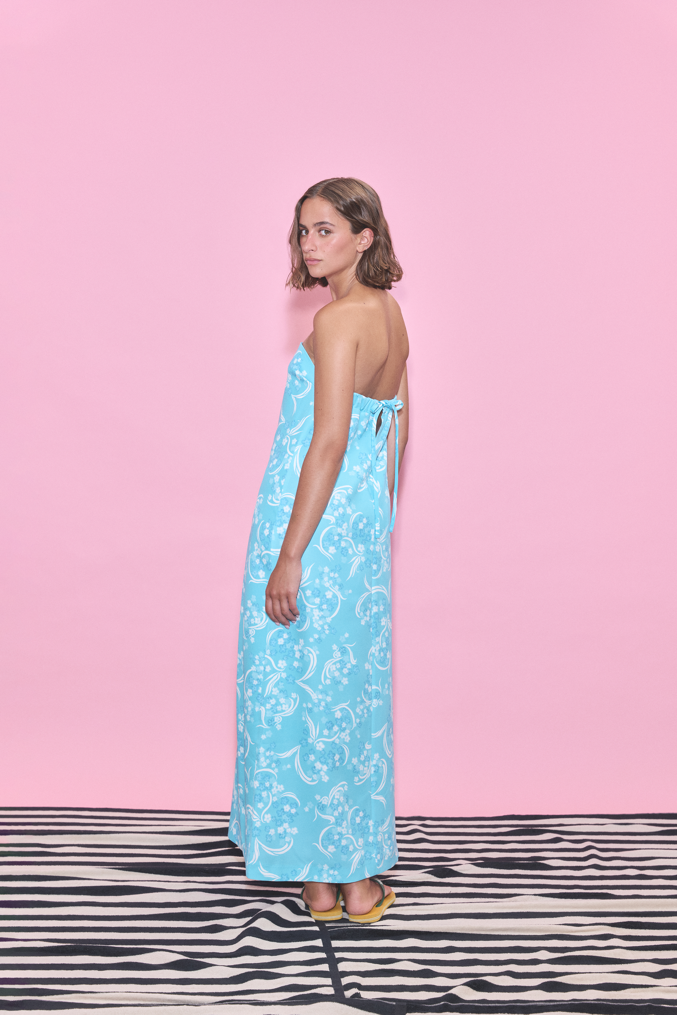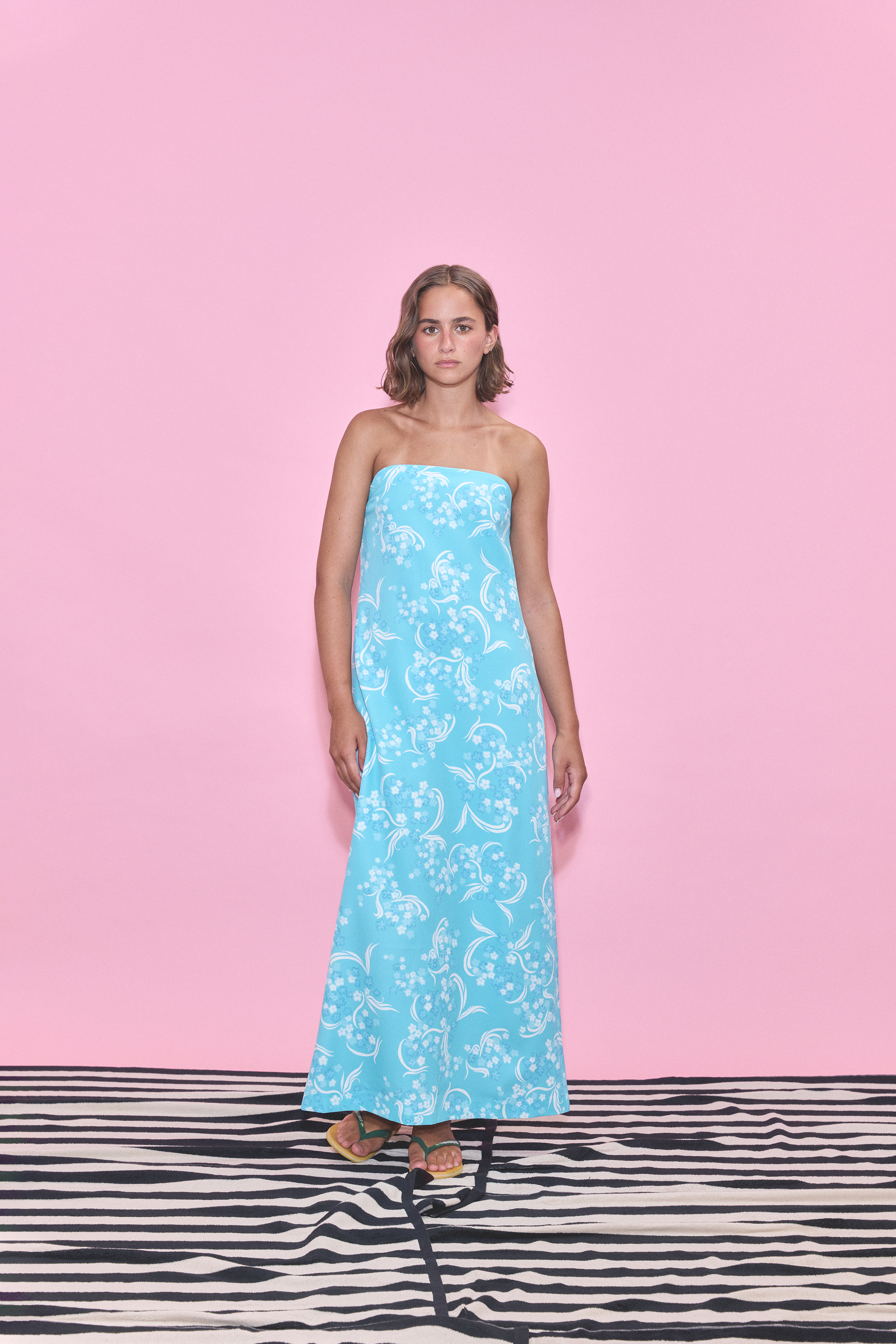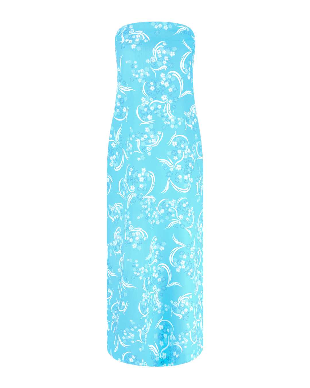 An elegant long strapless dress with a blue base and a hand-painted print of flowers with a back tie closure