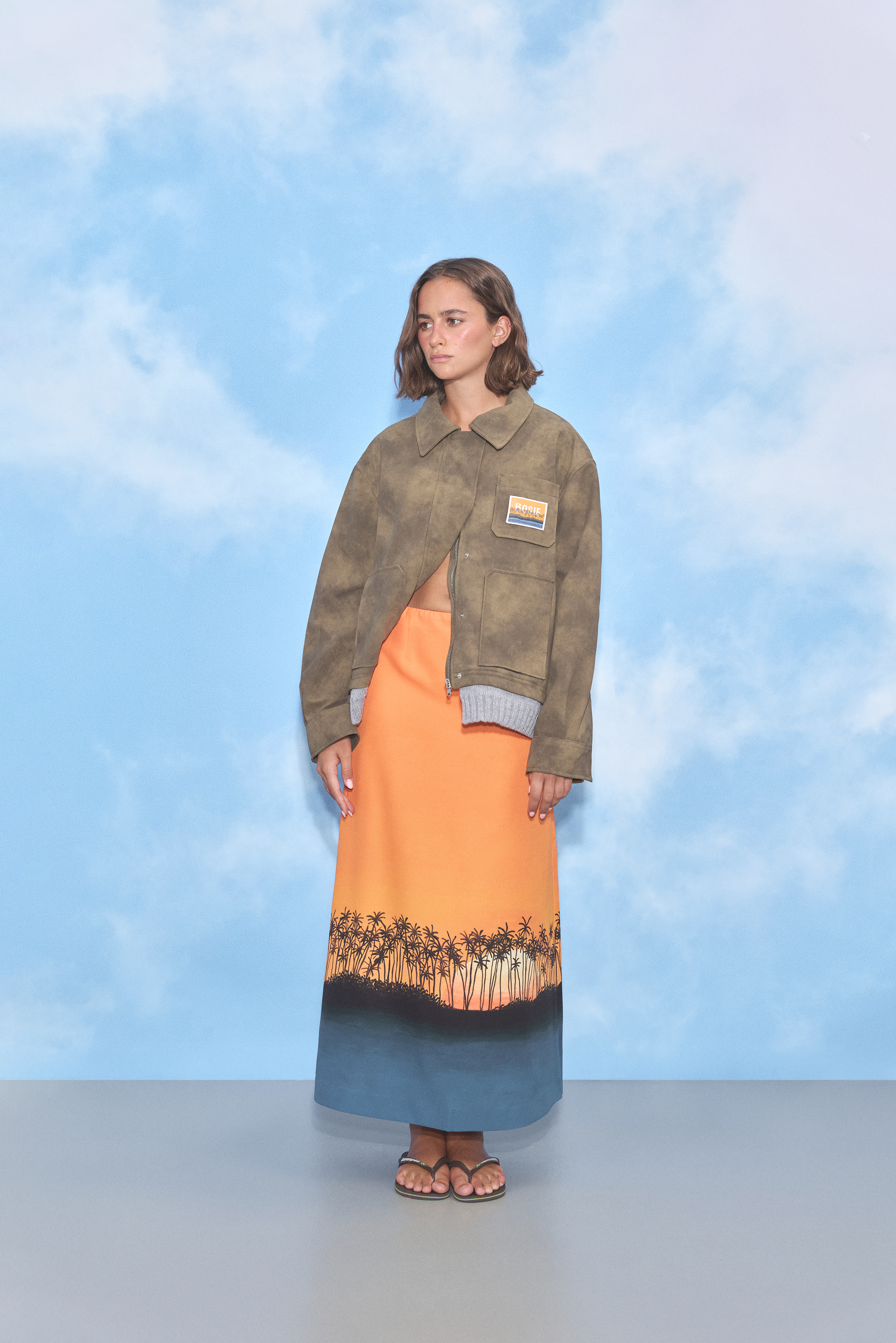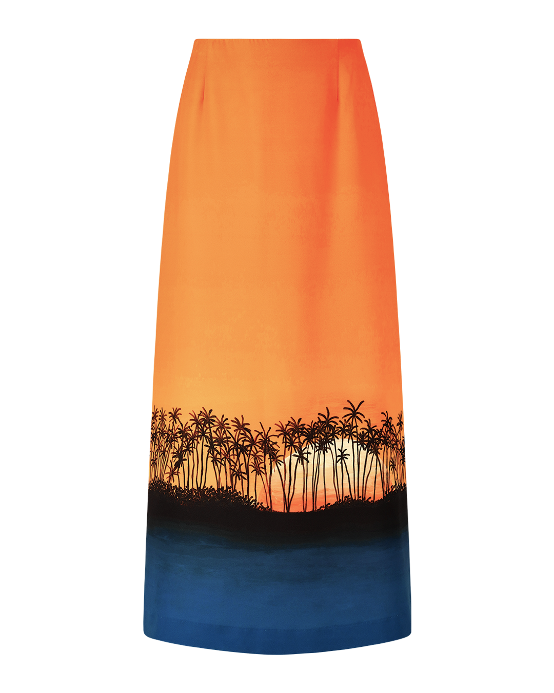 A timeless yet unique skirt with an in-house painted sunset with palm trees on an orange base