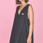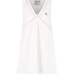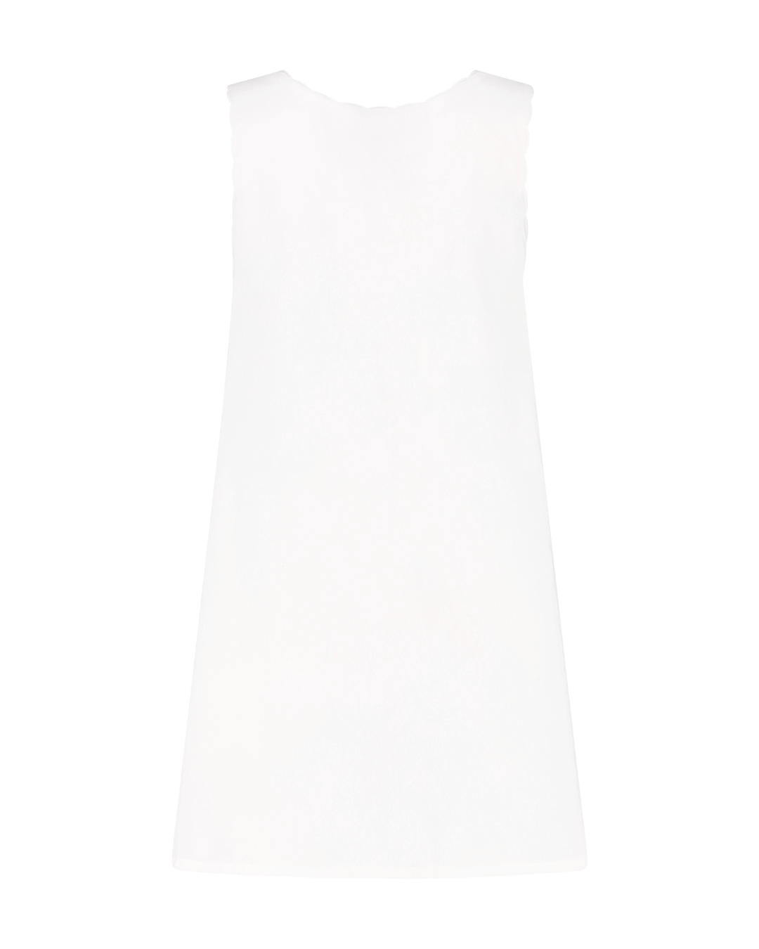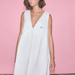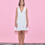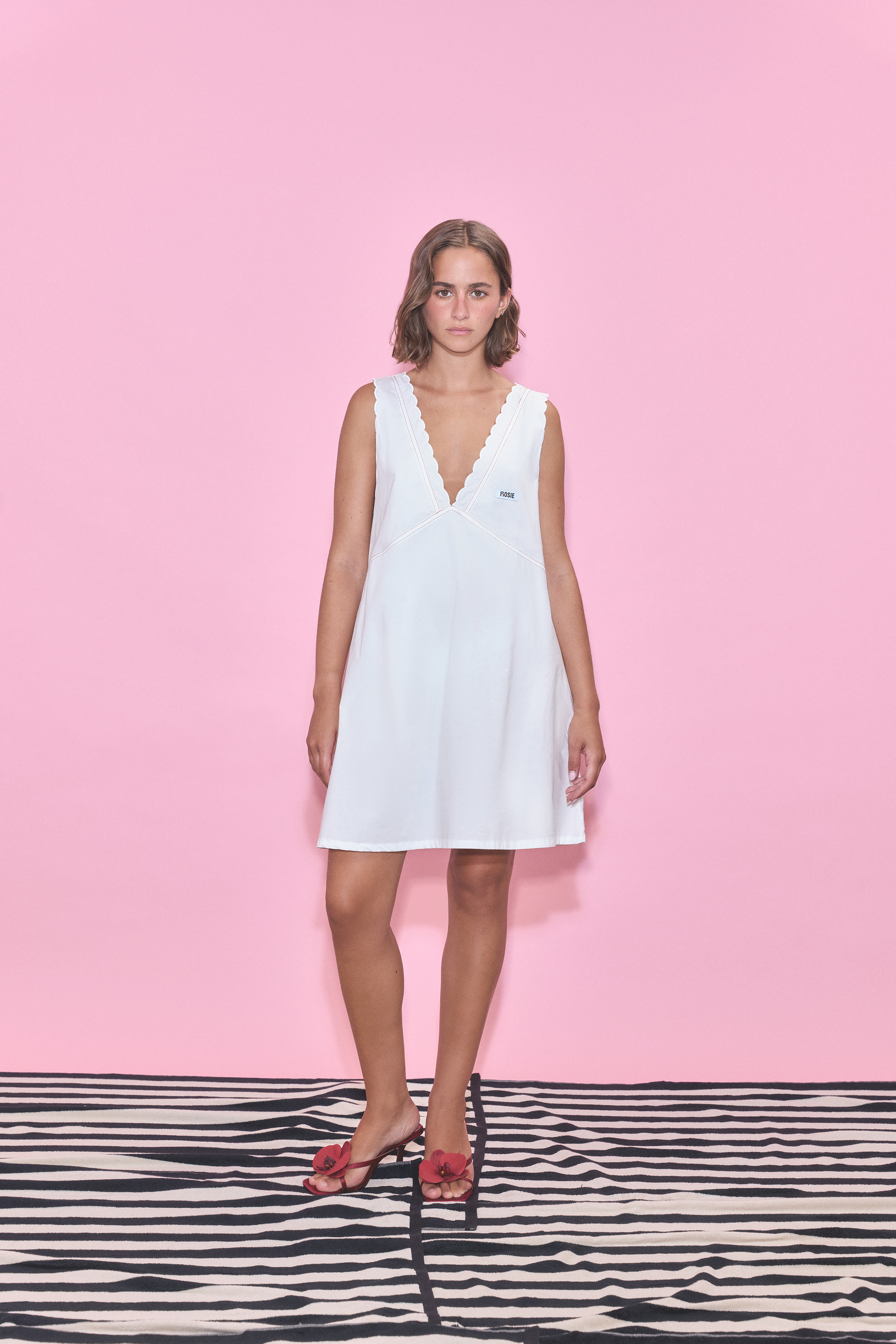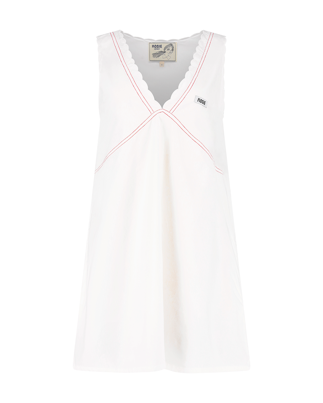 A white short cotton dress with V-neck, scalloped detailing, red stitching, and a Rosie label