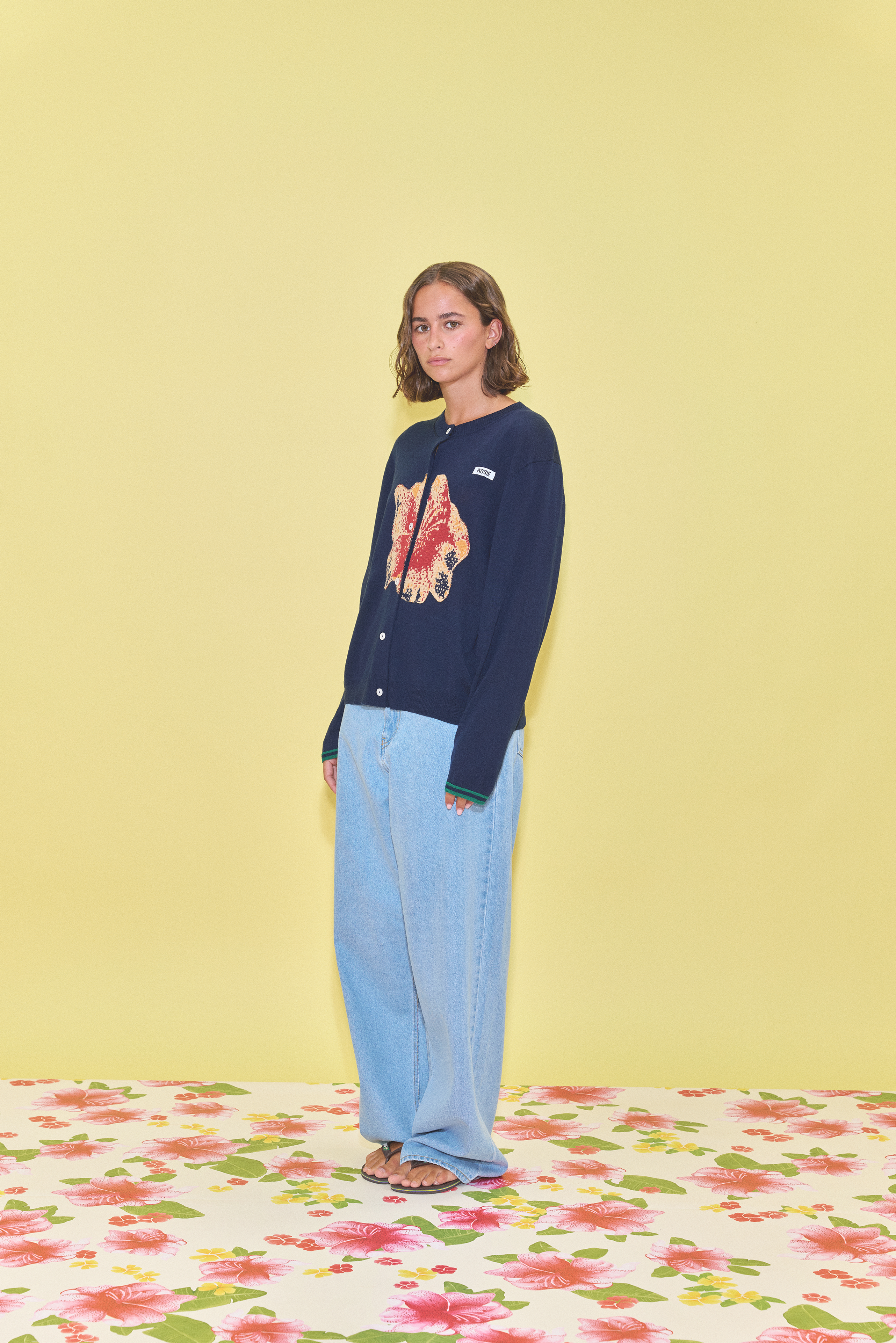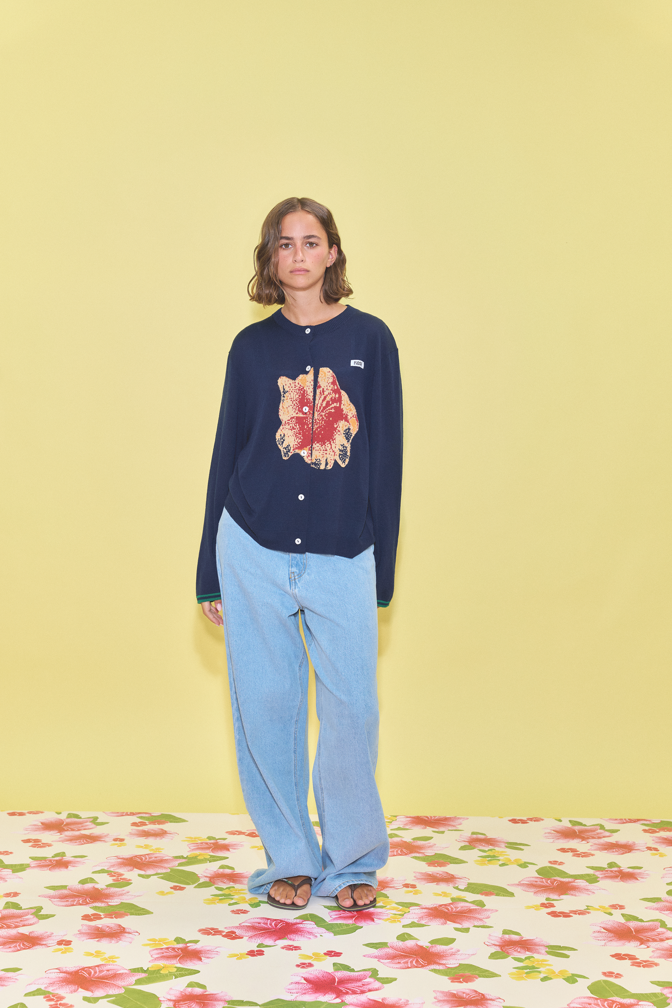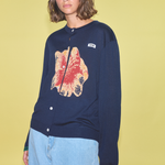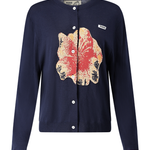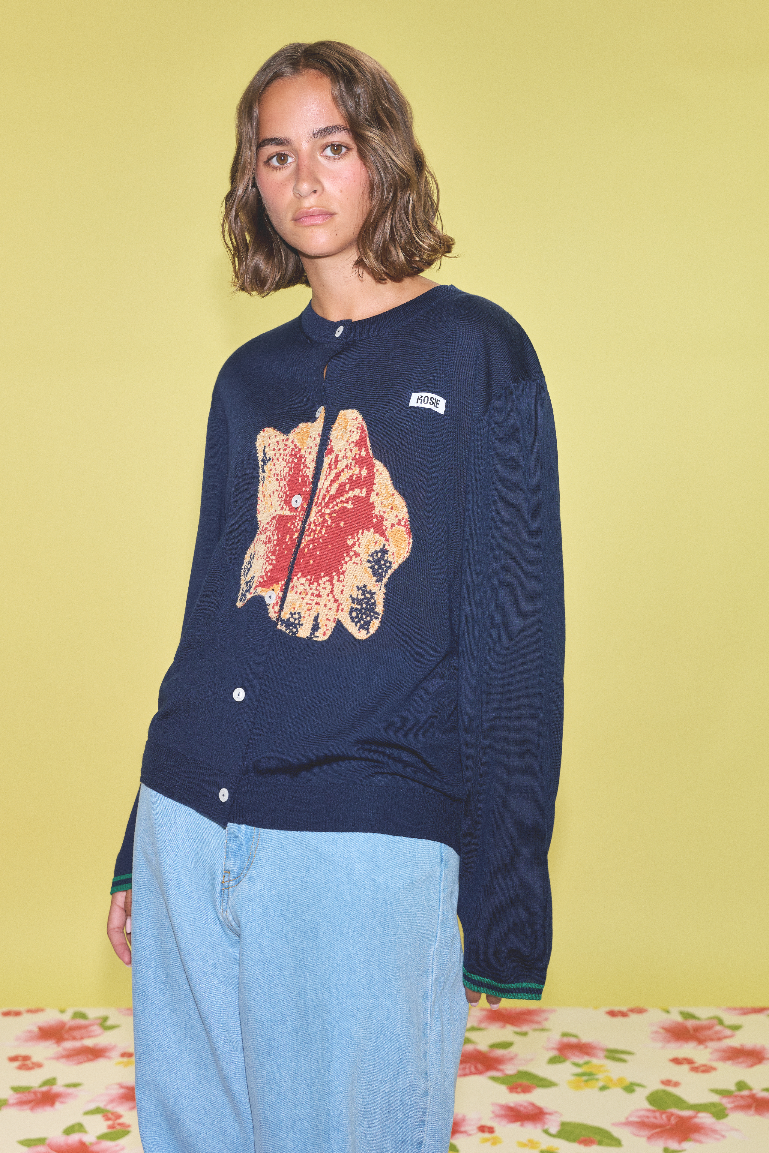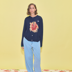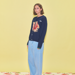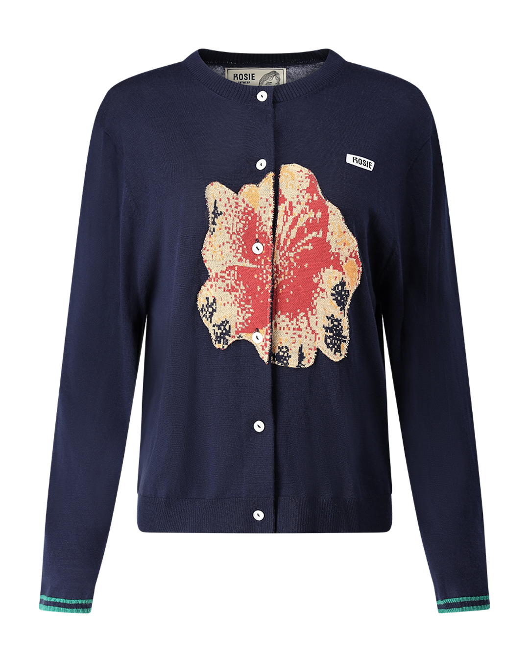 A navy cardigan featuring a flower intarsia knitted on the front and green stripes on the sleeve cuffs