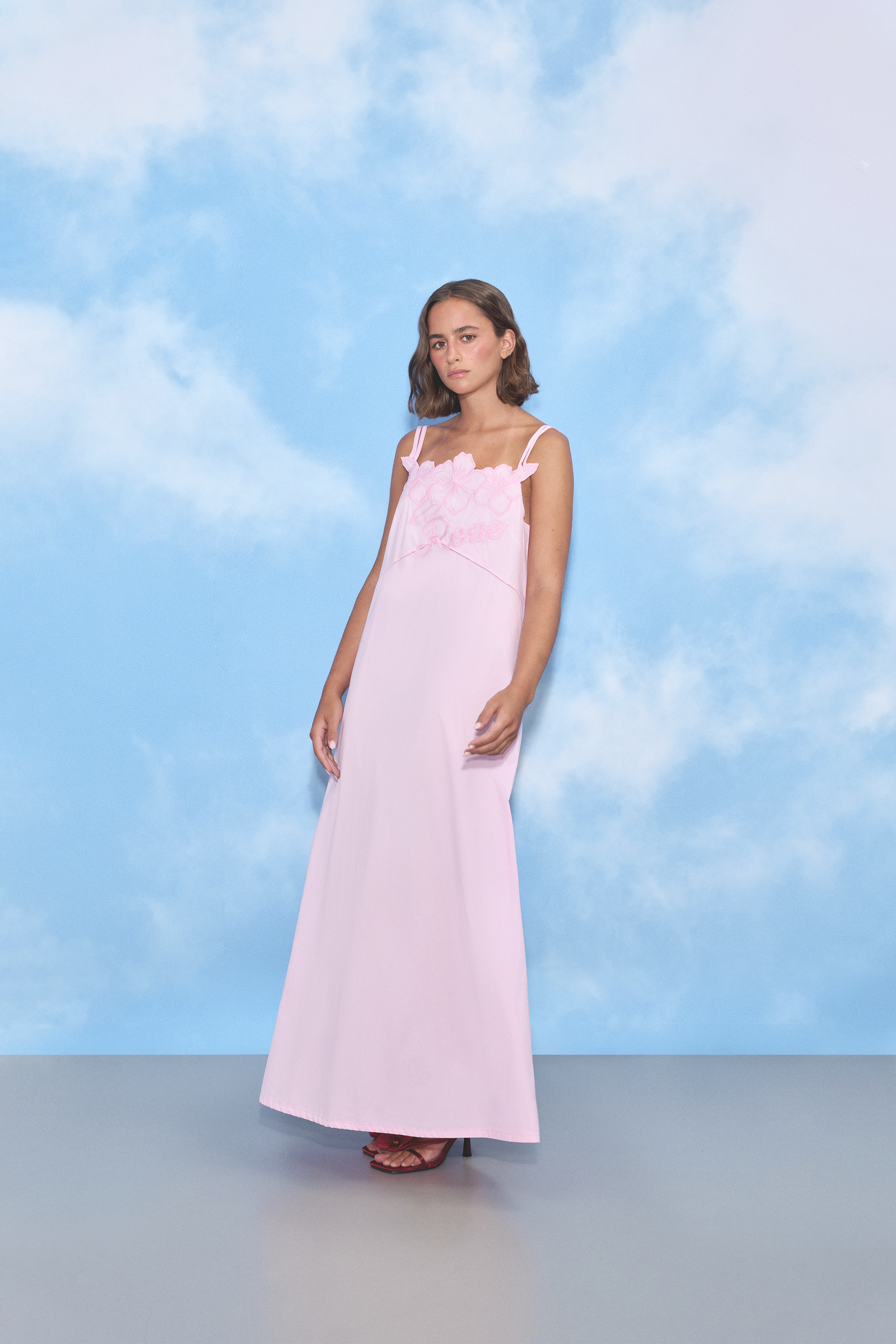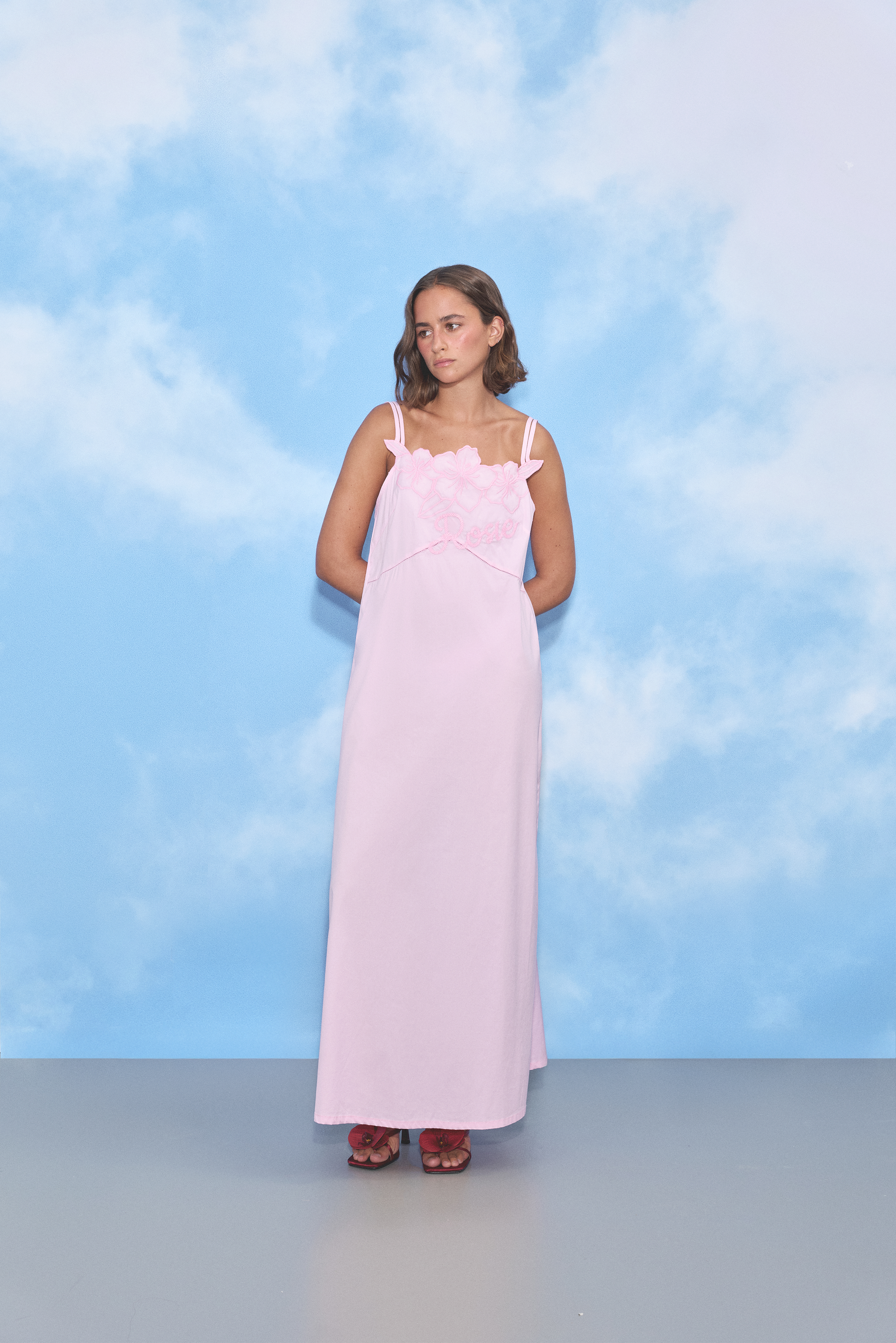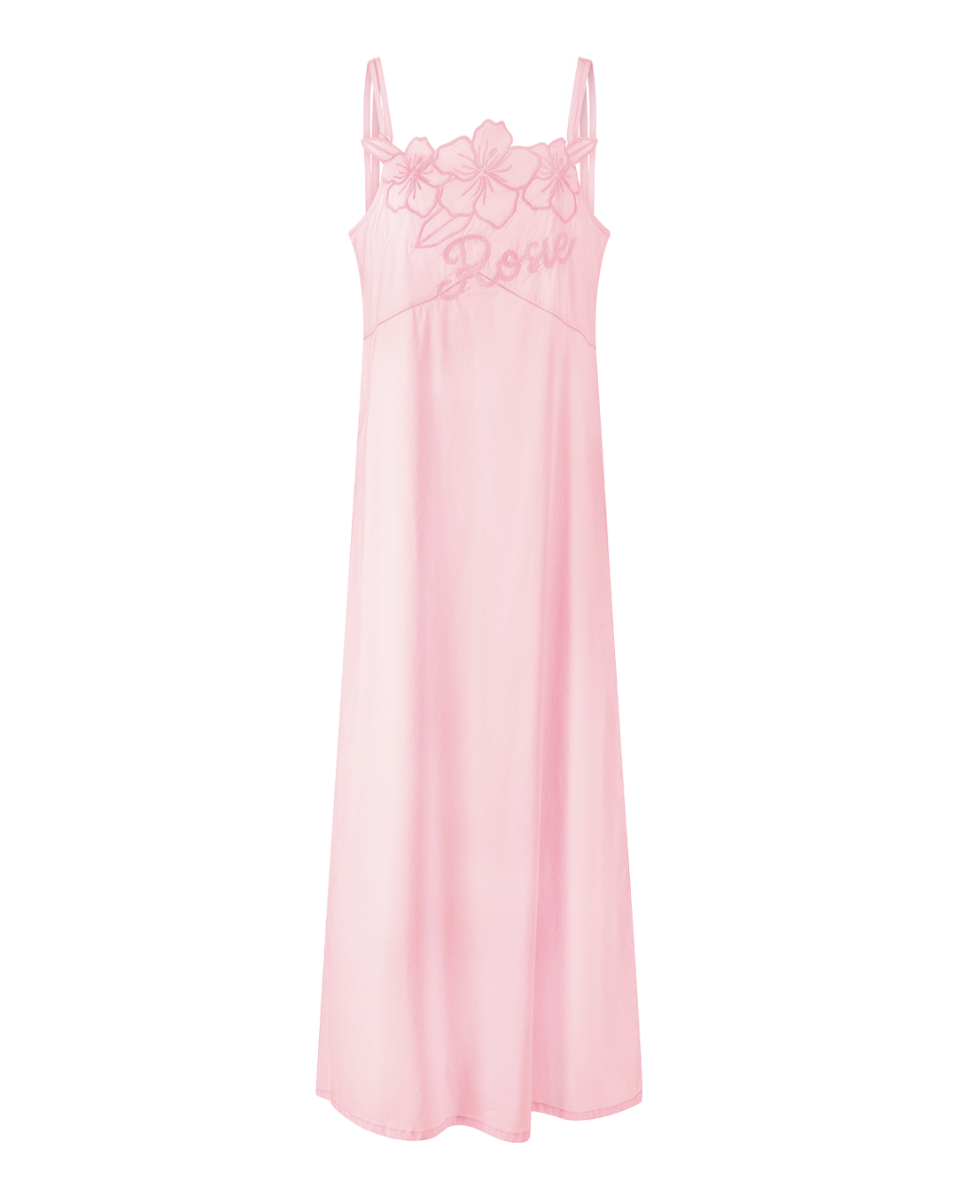A long pink cotton dress with straps featuring a Rosie & flowers embroidery