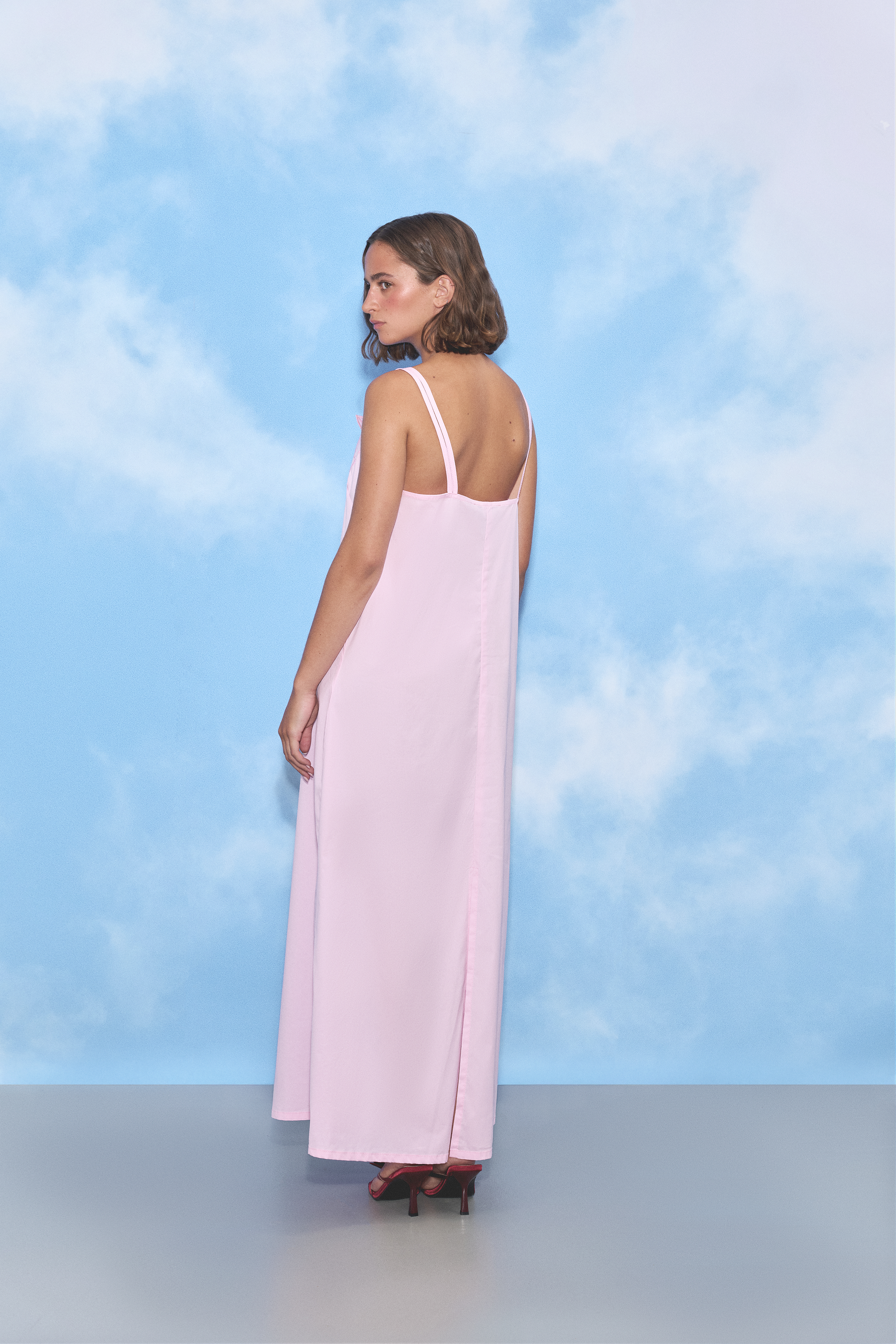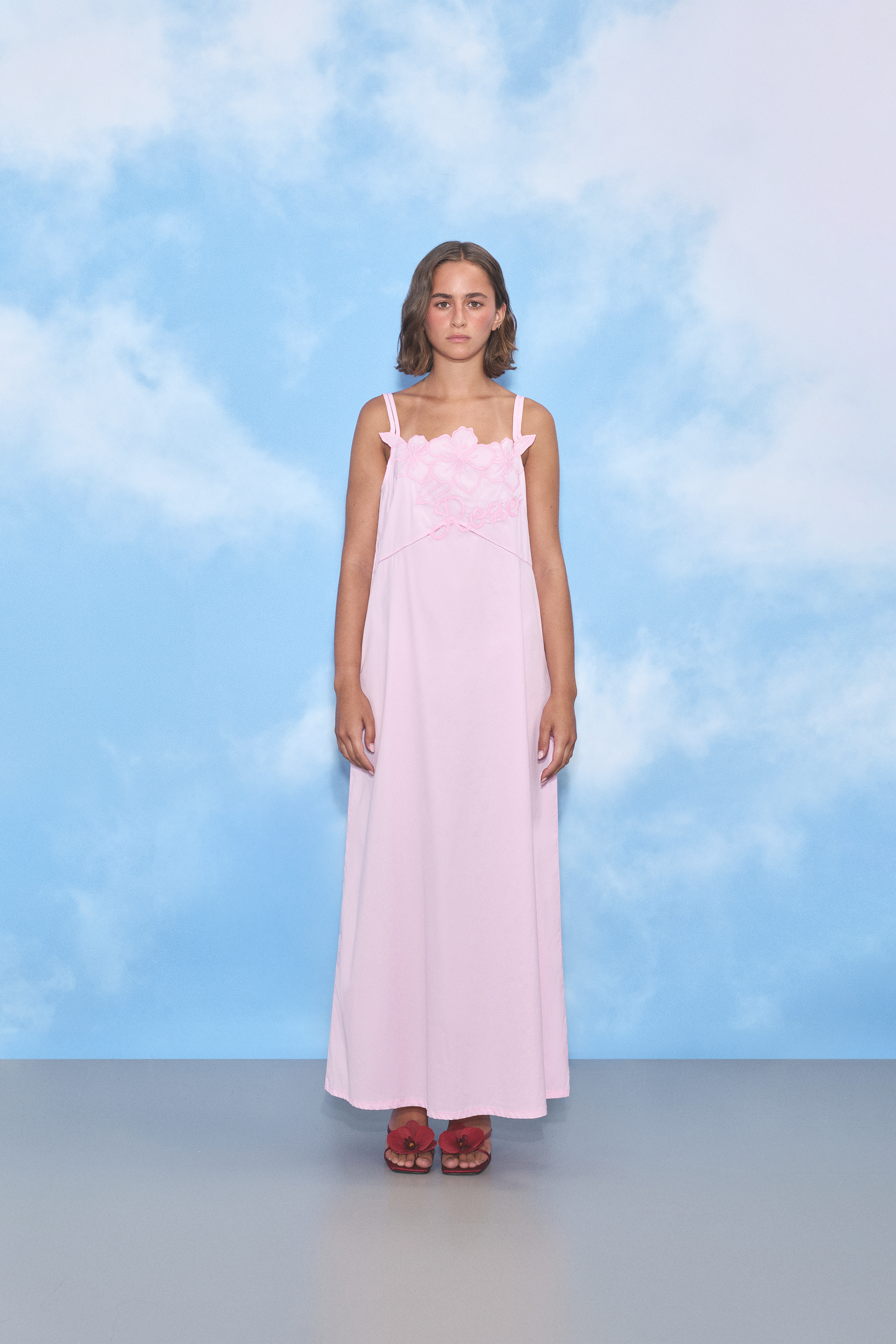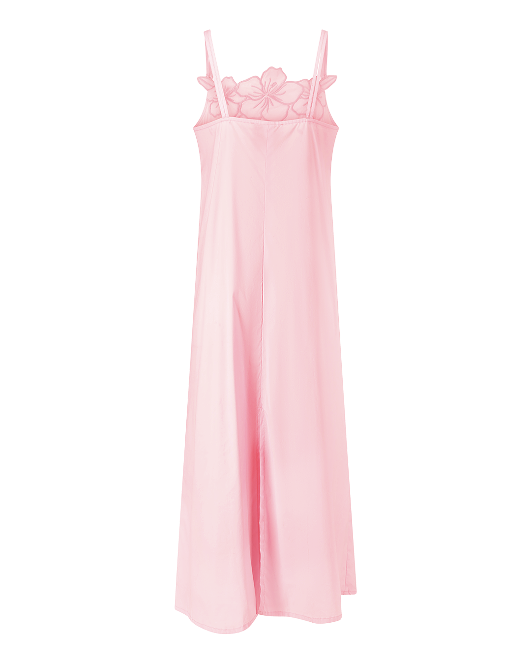 A long pink cotton dress with straps featuring a Rosie & flowers embroidery