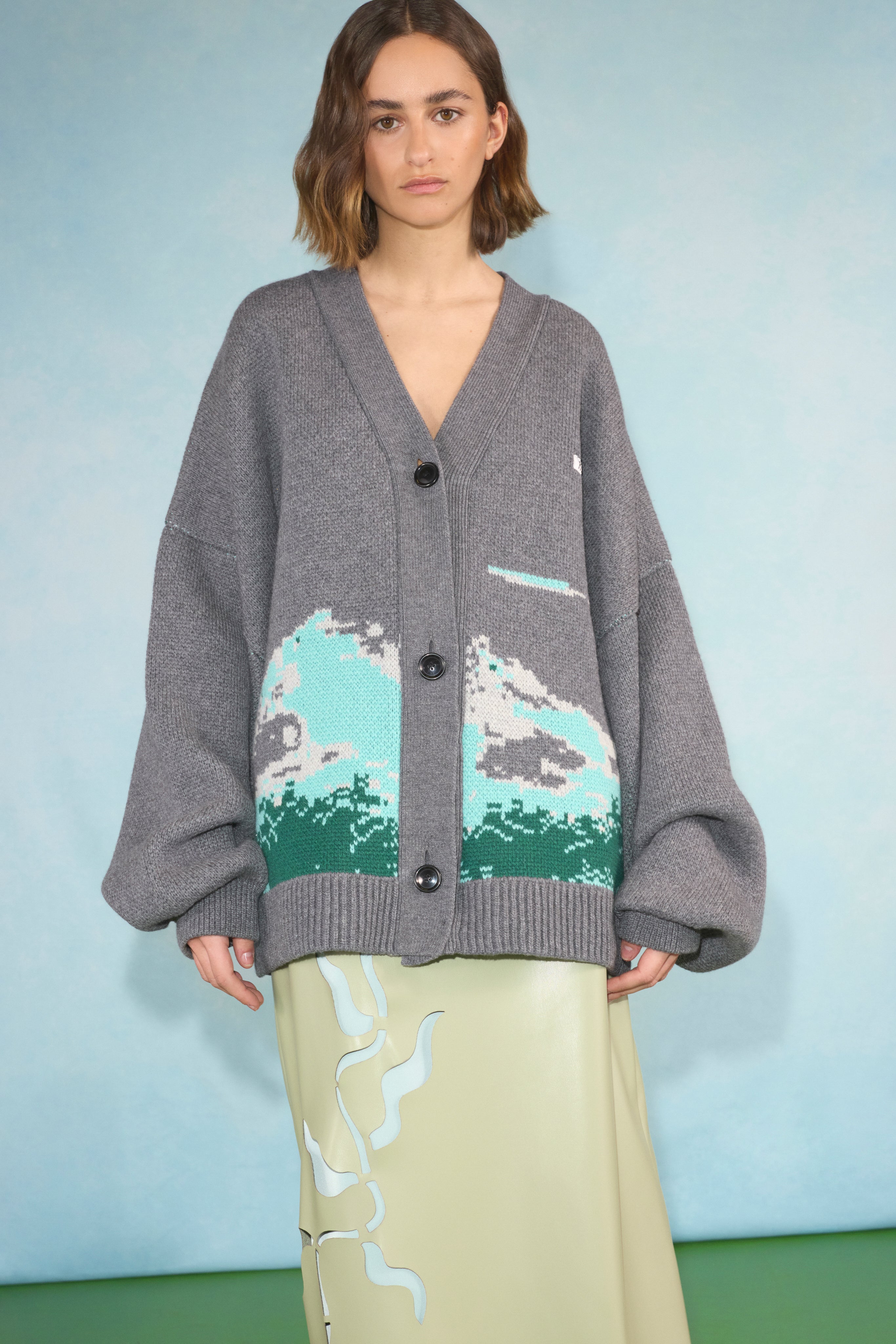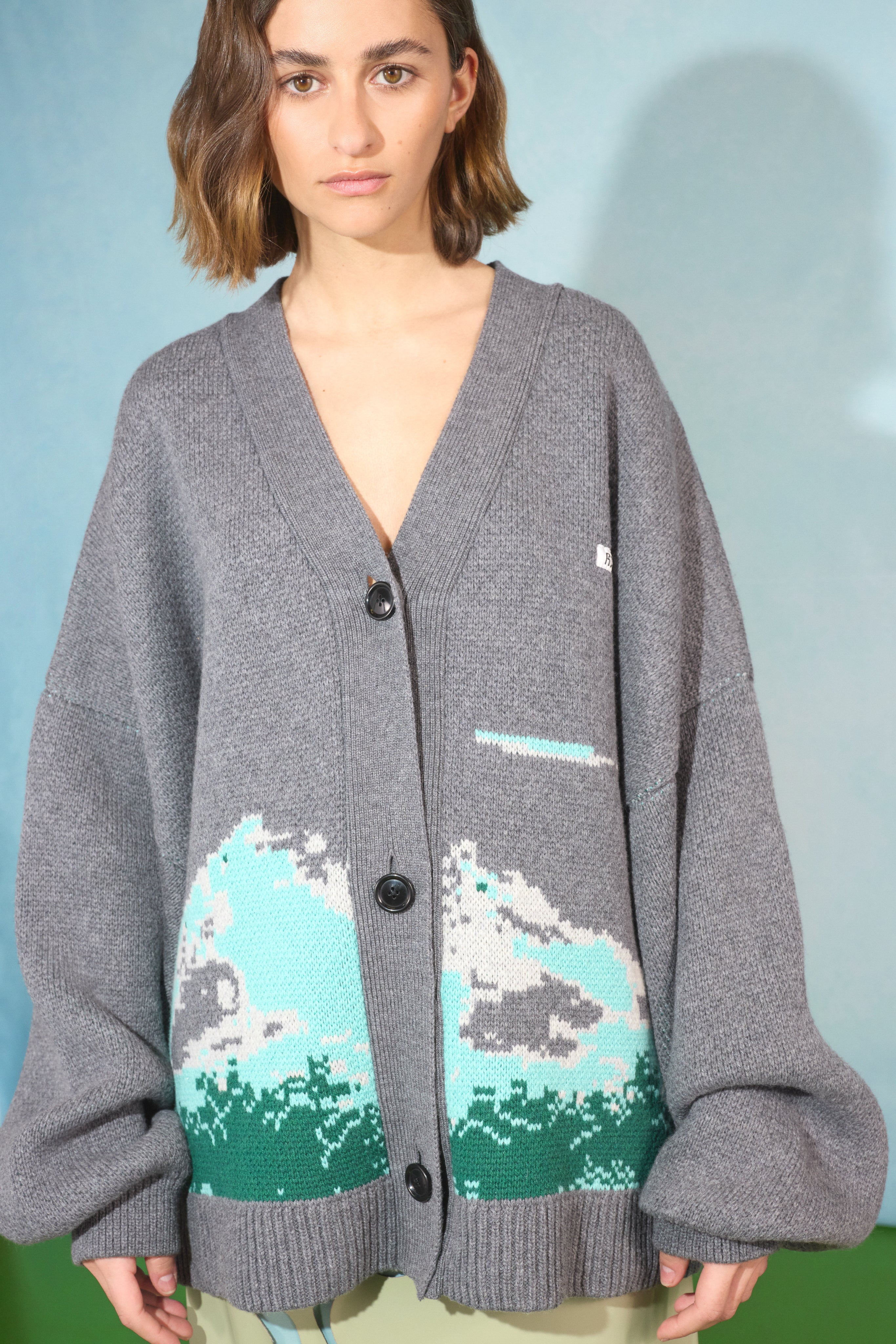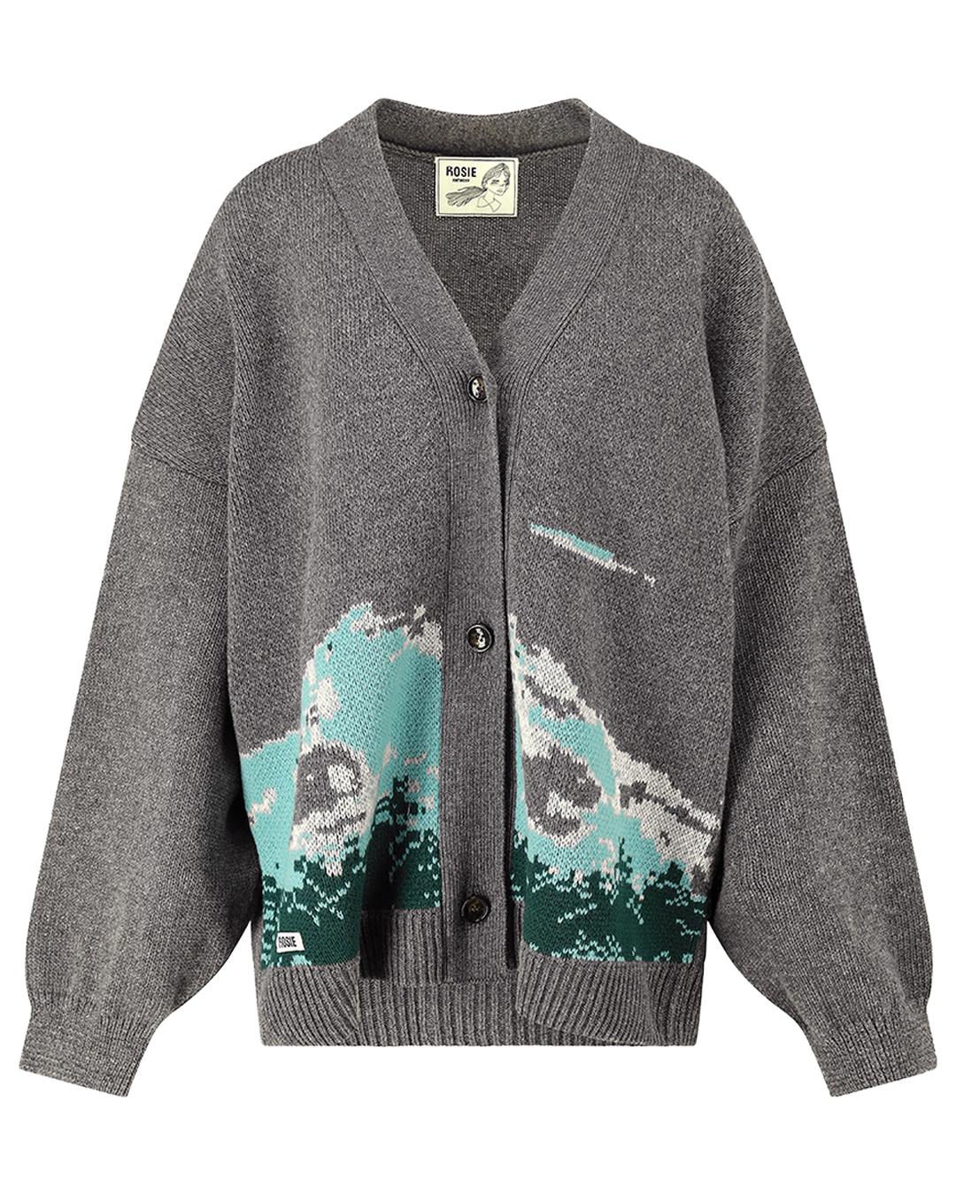 A grey knitted oversized cardigan featuring an intarsia knitted landscape and a small ROSIE label