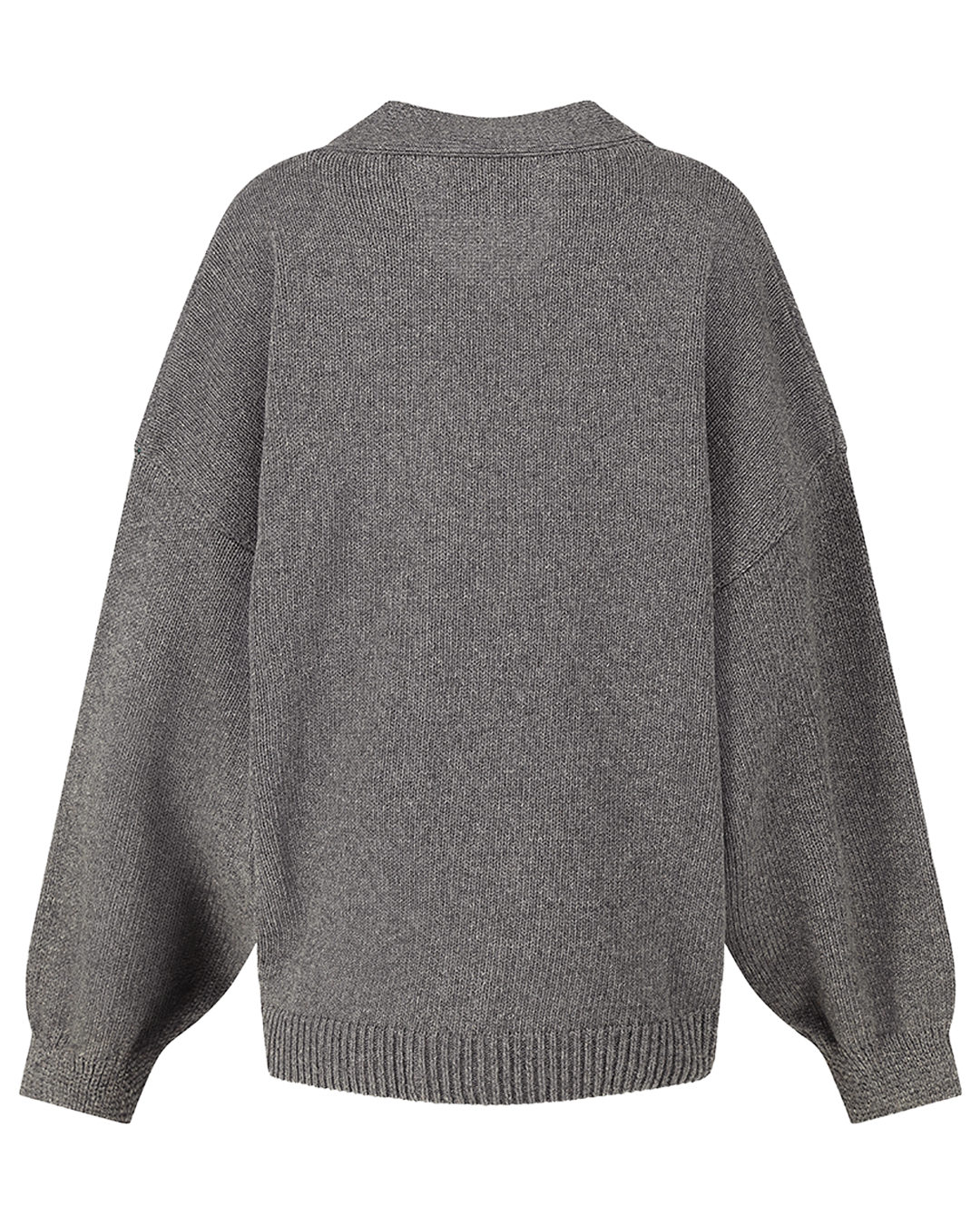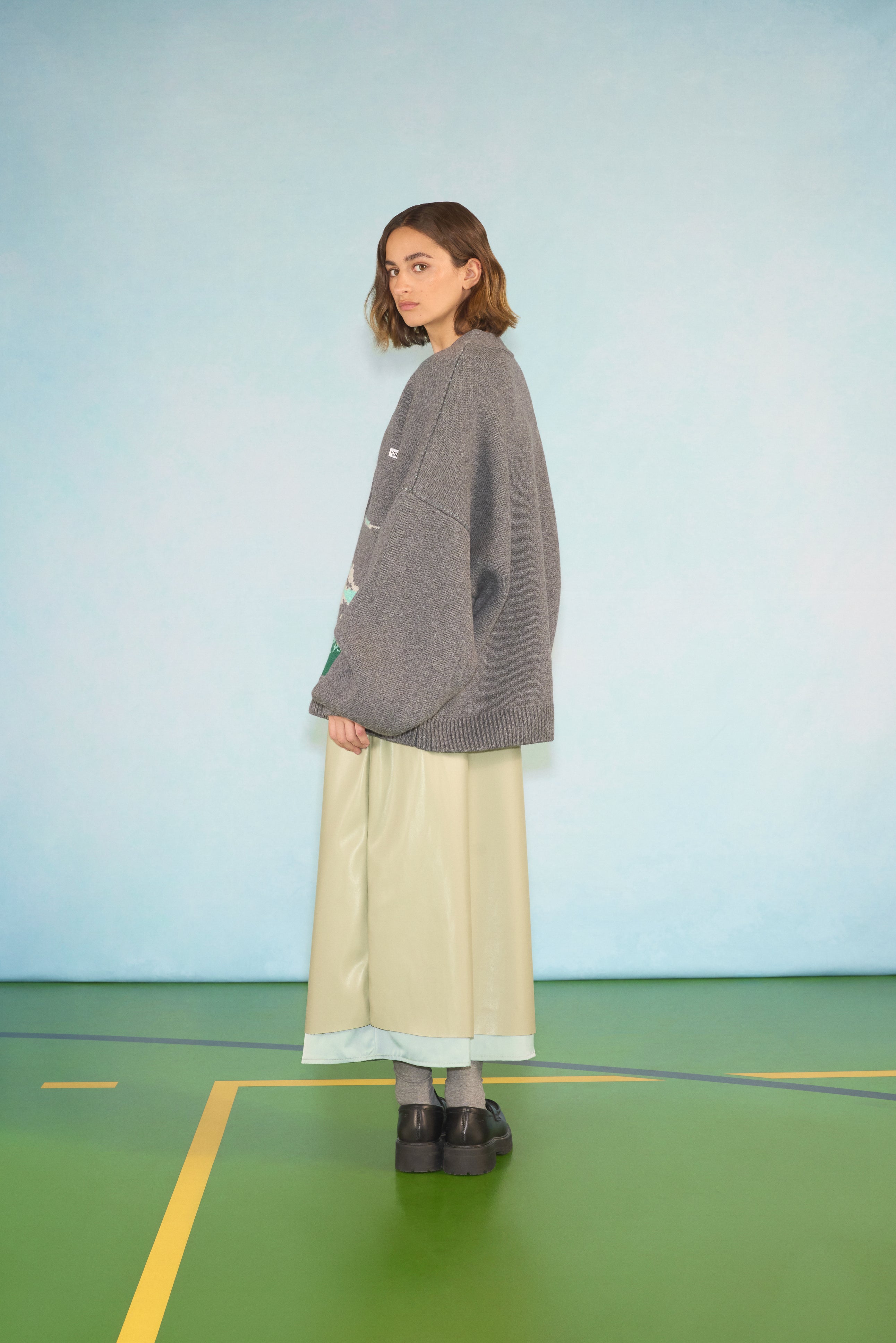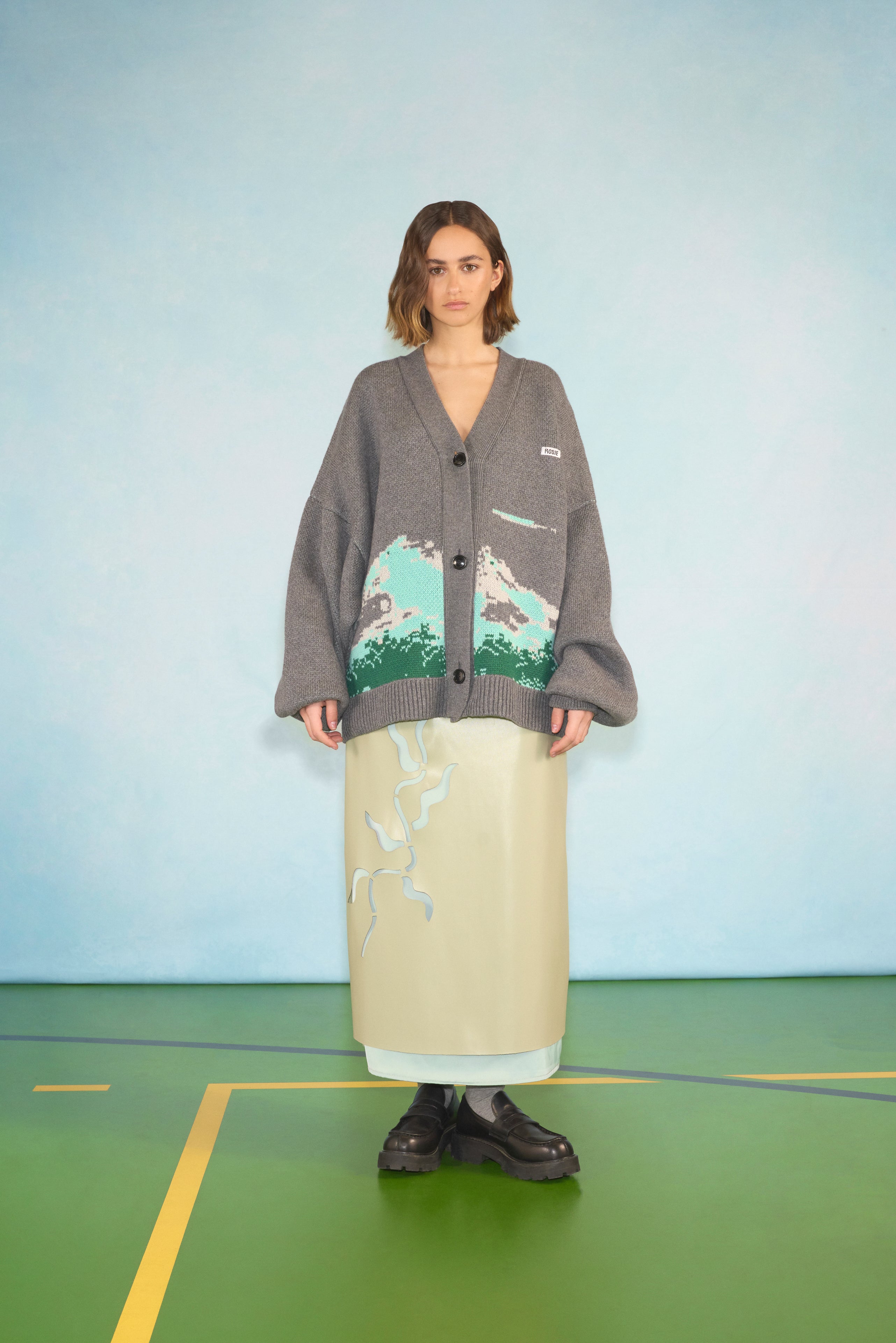 A grey knitted oversized cardigan featuring an intarsia knitted landscape and a small ROSIE label