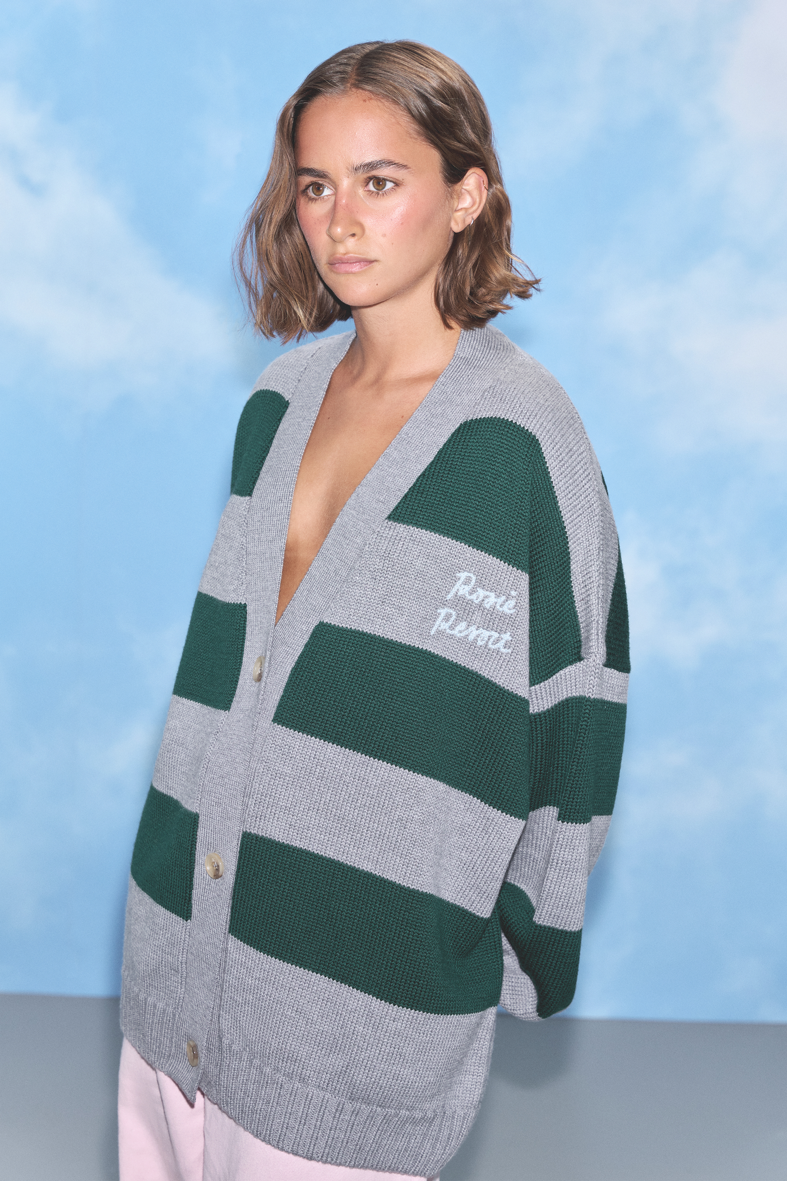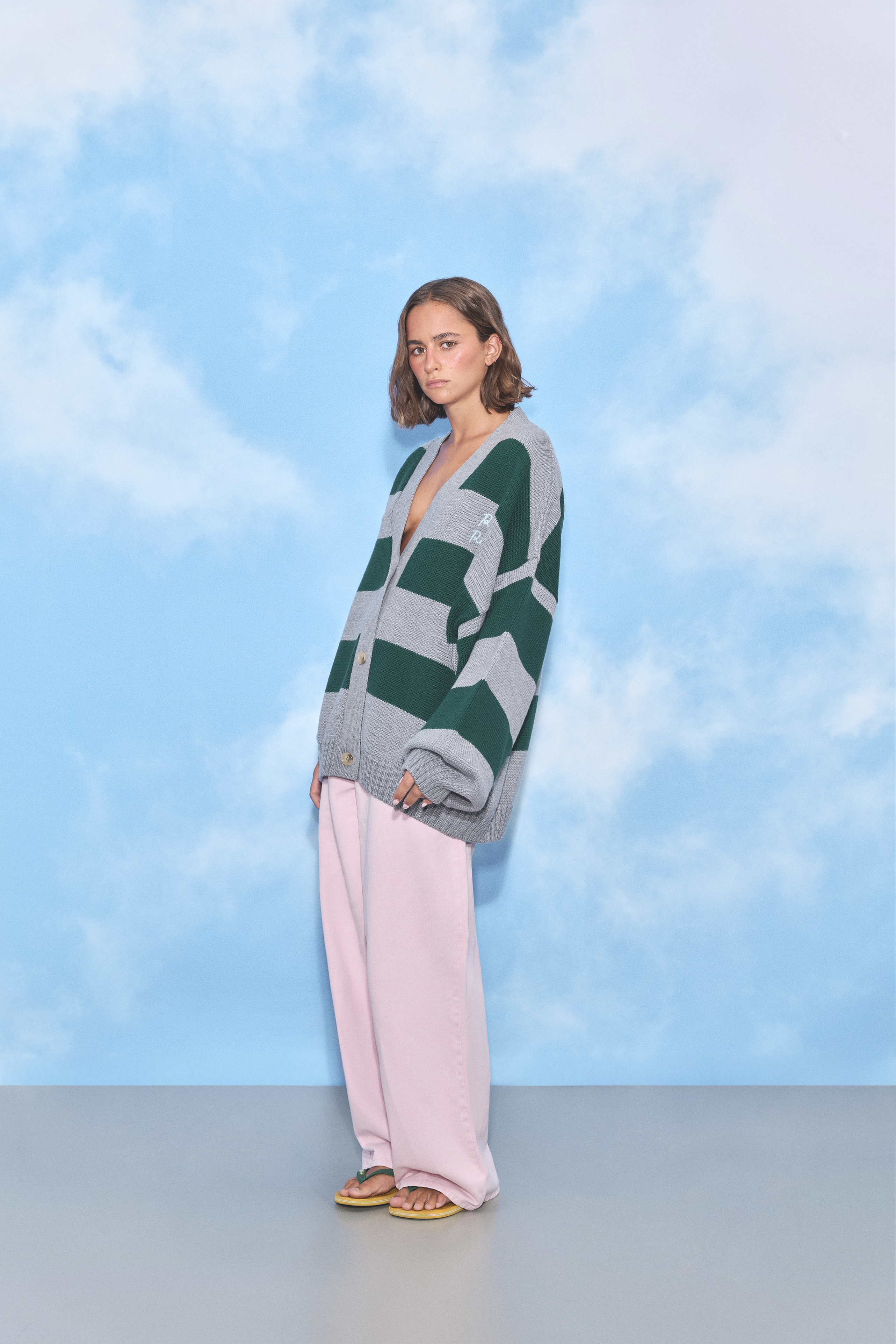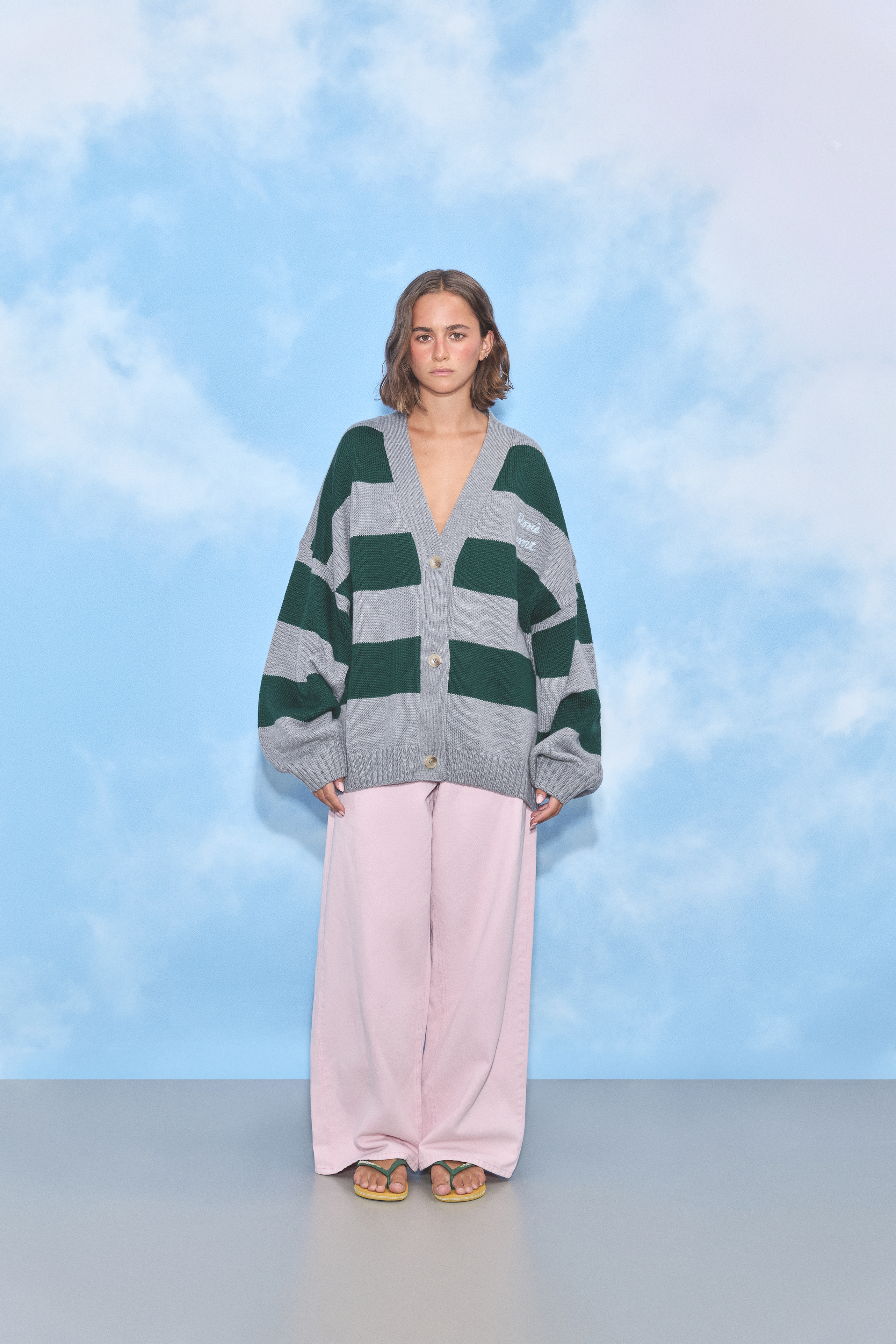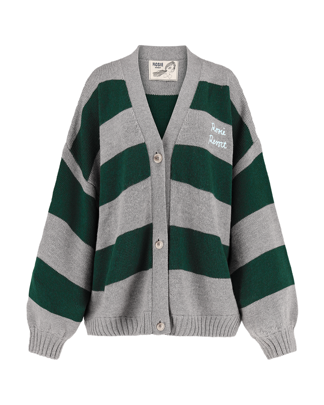 A grey and green striped oversized knitted cardigan featuring light blue Rosie embroidery